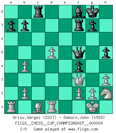 Last move : 1-0 2021 October 2 12:37:16 [Event "FICGS__CHESS__CUP_CHAMPIONSHIP__000004"] [Site "FICGS"] [Date "2021.09.20"] [Round "1"] [White "Orlov,Vladimir"] [Black "Osborn,John"] [Result "1-0"] [WhiteElo "2207"] [BlackElo "1933"] 1.e4 e5 2.Nf3 Nf6 3.Nxe5 d6 4.Nf3 Nxe4 5.d4 d5 6.Bd3 Nc6 7.O-O Be7 8.Nbd2 Bf5 9.Re1 Nxd2 10.Qxd2 Qd7 11.Bxf5 Qxf5 12.Ne5 Nd8 13.Qa5 c6 14.c4 f6 15.h3 O-O 16.Ng4 Rf7 17.Ne3 Qd7 18.cxd5 Bf8 19.Rd1 f5 20.dxc6 Nxc6 21.Qc3 f4 22.Ng4 Rc8 23.a3 h6 24.d5 h5 25.Nh2 Nb4 26.Qf3 Qf5 27.axb4 1-0 Petrov : Classical attack Kingside Castling by player White (move 7) Kingside Castling by player Black (move 15) Player White won this chess game. Follow this game move after move (download)All my games are real. (Bobby Fischer) Wenn ich Weiß habe gewinne ich weil ich Weiß habe, wenn ich Schwarz habe gewinne ich weil ich Bogoljubov bin. (Efim Bogoljubov) Fischer es el jugador mas fuerte del mundo. De hecho, el jugador mas fuerte que jamas haya existido. (Larry Evans) J'ai toujours senti une vague pitié pour l'homme qui ne connaît rien aux échecs, tout comme j'en aurais pour un homme ignorant de l'amour. Les Echecs, comme la musique ou comme l'amour, ont le pouvoir de rendre heureux. (Siegbert Tarrasch) Winning isn't everything... but losing is nothing. (Mednis)
