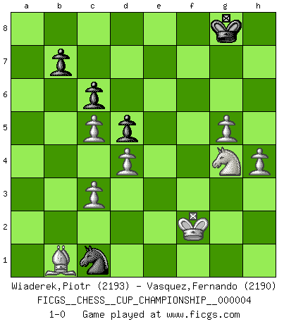 Last move : 1-0 2022 January 11 4:38:19 [Event "FICGS__CHESS__CUP_CHAMPIONSHIP__000004"] [Site "FICGS"] [Date "2021.09.20"] [Round "1"] [White "Wiaderek,Piotr"] [Black "Vasquez,Fernando"] [Result "1-0"] [WhiteElo "2193"] [BlackElo "2190"] 1.e4 e5 2.Nf3 Nf6 3.Nxe5 d6 4.Nf3 Nxe4 5.d4 d5 6.Bd3 Nc6 7.O-O Be7 8.c4 Nb4 9.Be2 O-O 10.Nc3 Be6 11.h3 Re8 12.Be3 Bf6 13.Qa4 Nxc3 14.bxc3 Nc6 15.Rfb1 Rb8 16.c5 Bd7 17.Qb3 Bf5 18.Re1 h6 19.Bf4 Re4 20.Bg3 Qd7 21.Nd2 Re7 22.Bb5 a6 23.Bf1 Qd8 24.Rxe7 Nxe7 25.a4 Ng6 26.Qd1 Bg5 27.a5 Bf6 28.Qf3 Ne7 29.Bf4 Rc8 30.Ra2 Bg5 31.Rb2 Bxf4 32.Qxf4 Rb8 33.Nf3 f6 34.Ne1 g5 35.Qg3 Nc6 36.Nc2 Be4 37.Ne3 Nxa5 38.h4 Qd7 39.Bxa6 Qf7 40.hxg5 hxg5 41.f3 Bg6 42.f4 c6 43.fxg5 Ra8 44.Ng4 Kh8 45.Bf1 Nc4 46.Rf2 Qe7 47.Rxf6 Qg7 48.Qh3+ Qh7 49.Rxg6 Qxh3 50.gxh3 Nd2 51.Bd3 Rg8 52.Rh6+ Kg7 53.Rg6+ Kf8 54.Rxg8+ Kxg8 55.Kf2 Nb3 56.h4 Nc1 57.Bb1 1-0 Petrov : Classical attack Kingside Castling by player White (move 7) Kingside Castling by player Black (move 9) Player White won this chess game. Follow this game move after move (download)Chess is as much a mystery as women. (Purdy) Der 70jährige Viktor Kortschnoi: Die Rentenanstalt wollte mich zwingen in Rente zu gehen. Meine Frau erhält jetzt eine Pension- und ich zahle weiter in die Rentenkasse ein! (Viktor Kortschnoi) Un sacrificio se refuta mucho mejor al aceptarlo. (Wilhelm Steinitz) Pour moi, les échecs ne sont pas un jeu mais un art. (Alexandre Alekhine) The age of a woman doesn't mean a thing. The best tunes are played on the oldest fiddles. (Ralph Waldo Emerson)