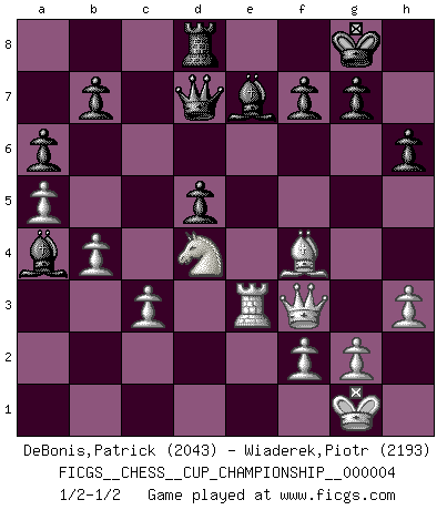 Last move : 1/2-1/2 2021 November 7 5:28:19 [Event "FICGS__CHESS__CUP_CHAMPIONSHIP__000004"] [Site "FICGS"] [Date "2021.09.20"] [Round "1"] [White "DeBonis,Patrick"] [Black "Wiaderek,Piotr"] [Result "1/2-1/2"] [WhiteElo "2043"] [BlackElo "2193"] 1.e4 e6 2.d4 d5 3.Nd2 c5 4.exd5 Qxd5 5.Ngf3 cxd4 6.Bc4 Qd6 7.O-O Nf6 8.Nb3 Nc6 9.Nbxd4 Nxd4 10.Nxd4 Be7 11.c3 O-O 12.Qf3 Qc7 13.Bd3 Bd7 14.Re1 Rfe8 15.Nb5 Qb6 16.a4 a6 17.a5 Qc5 18.b4 Qc8 19.Nd4 h6 20.h3 Bf8 21.Bf4 Nd5 22.Bd2 Qc7 23.Be4 Rad8 24.Bxd5 exd5 25.Rxe8 Bxe8 26.Re1 Ba4 27.Bf4 Qd7 28.Re5 Rc8 29.Bd2 Rd8 30.Bf4 Be7 31.Re3 1/2-1/2 French : Tarrasch, Open variation Kingside Castling by player White (move 7) Kingside Castling by player Black (move 11) This chess game ended in a draw. Follow this game move after move (download)I'd rather have a Pawn than a finger. (Reuben Fine) Dieses schreckliche Gefühl, dass ich gegen eine Maschine spielte, die niemals Fehler macht, zerschmetterte meinen Widerstand. (Mark Taimanov) No solamente yo pronostico su triunfo sobre Botvinnik, sino que me adelanto y digo que probablemente Fischer es el jugador de Ajedrez mas grande que haya existido. (John Collins) Le jeu d'échecs fait naître et fortifie en nous plusieurs qualités précieuses dans le cours de l'existence, telles que la prévoyance, la circonspection, la prudence, et la persévérance. (Benjamin Franklin - 1783, la morale des échecs) You have to believe in yourself. (Sun Tzu)