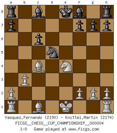 Last move : 1-0 2021 November 21 5:17:28 [Event "FICGS__CHESS__CUP_CHAMPIONSHIP__000004"] [Site "FICGS"] [Date "2021.09.20"] [Round "1"] [White "Vasquez,Fernando"] [Black "Knittel,Martin"] [Result "1-0"] [WhiteElo "2190"] [BlackElo "2174"] 1.e4 e5 2.Nf3 Nc6 3.d4 exd4 4.Nxd4 Nf6 5.Nxc6 bxc6 6.e5 Qe7 7.Qe2 Nd5 8.c4 Nb6 9.Nc3 Qe6 10.Qe4 d5 11.exd6 Qxe4+ 12.Nxe4 cxd6 13.b3 d5 14.cxd5 Nxd5 15.Bc4 1-0 This chess game has been lost on time (started : 2021.09.20 1:58:51) Scotch : Mieses variation Player White won this chess game. Follow this game move after move (download)I played Chess with him and would have beaten him sometimes only he always took back his last move, and ran the game out differently. (Mark Twain) Gegen einen Schachcomputer zu verlieren ist wie Löcher in den Strümpfen zuhaben. Es ist nicht peinlich, solange man der einzige ist der es weiß. (Anonymous) Aquel que teme a un Peón de Reina aislado, debería de retirarse del Ajedrez. (Siegbert Tarrasch) Mais n'est-ce pas déjà le limiter injurieusement que d'appeler les échecs un jeu? N'est-ce pas aussi une science, un art, ou quelque chose qui, comme le cercueil de Mahomet entre ciel et terre, est suspendu entre l'un et l'autre, et qui réunit un nombre incroyable de contraires ? (Stefan Zweig) When you don't know what to do, walk fast and look worried. (Anonymous)