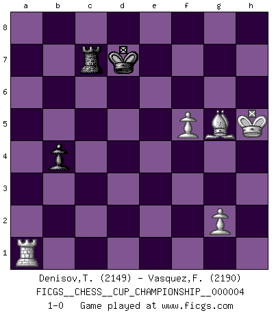 Last move : 1-0 2022 January 17 4:41:51 [Event "FICGS__CHESS__CUP_CHAMPIONSHIP__000004"] [Site "FICGS"] [Date "2021.09.20"] [Round "1"] [White "Denisov,Timofey"] [Black "Vasquez,Fernando"] [Result "1-0"] [WhiteElo "2149"] [BlackElo "2190"] 1.d4 Nf6 2.c4 e6 3.Nf3 b6 4.a3 Bb7 5.Nc3 d5 6.cxd5 Nxd5 7.Qc2 Nxc3 8.bxc3 Be7 9.e4 O-O 10.Bd3 c5 11.O-O Qc7 12.Qe2 Nd7 13.a4 h6 14.Be3 Rac8 15.Rfd1 Rfd8 16.e5 Nb8 17.Ne1 cxd4 18.cxd4 Nc6 19.Qg4 Bf8 20.Nf3 Nb4 21.Bxh6 Nxd3 22.Rxd3 Qc6 23.R3d1 Qe4 24.Bf4 Bb4 25.h4 Bc3 26.Rac1 Bd5 27.h5 Rc4 28.Kh2 Rdc8 29.Kg3 Rxa4 30.h6 Qh7 31.Bg5 Rc6 32.hxg7 Qxg7 33.Rd3 Bb4 34.Rh1 f5 35.exf6 Bd6+ 36.Kh4 Qg6 37.Bf4 Qxg4+ 38.Kxg4 Be4 39.Rd2 Bxf3+ 40.Kxf3 Kf7 41.Bg5 Rc7 42.Kg4 Rac4 43.f4 a5 44.d5 exd5 45.Rxd5 Ke6 46.Rhd1 R7c6 47.f7 Kxf7 48.Rxd6 Rxd6 49.Rxd6 b5 50.Rd5 b4 51.Rxa5 Ke6 52.Kh5 Kd7 53.f5 Rc7 54.Ra1 1-0 Queen's Indian : Petrosian system Kingside Castling by player Black (move 9) Kingside Castling by player White (move 11) 10 pieces endgame at move 48 : White KRBPP , Black KRRPP WHITE : King + 1 Rook 1 Bishop 2 Pawns BLACK : King + 2 Rooks 2 Pawns 9 pieces endgame at move 49 : White KRBPP , Black KRPP WHITE : King + 1 Rook 1 Bishop 2 Pawns BLACK : King + 1 Rook 2 Pawns 8 pieces endgame at move 51 : White KRBPP , Black KRP WHITE : King + 1 Rook 1 Bishop 2 Pawns BLACK : King + 1 Rook 1 Pawn Player White won this chess game. Follow this game move after move (download)Chess is really ninety nine percent calculation. (Soltis) Der beste Spieler in einem Turnier gewinnt es nie. Er landet auf Platz zwei oder drei. (Siegbert Tarrasch) Buenas posiciones no logran ganar juegos, buenas movidas sí. (Gerald Abrahams) Echiquier : carré parfait, comme la Jérusalem nouvelle décrite par l'auteur de l'Apocalypse, huit cases sur huit, exaltation du chiffre 4, symbole du cosmos aux quatre horizons... où le noir et le blanc, l'ombre et la lumière, le mal et le bien s'entremêlent et se conjuguent. (Robert Couffignal, Le Gambit du poète) A good teacher is like a candle - it consumes itself to light the way for others. (Author unknown)