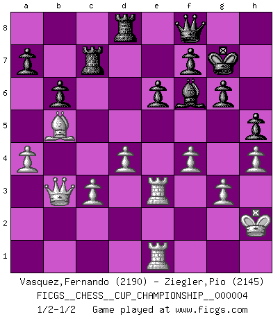 Last move : 1/2-1/2 2021 December 15 11:40:46 [Event "FICGS__CHESS__CUP_CHAMPIONSHIP__000004"] [Site "FICGS"] [Date "2021.09.20"] [Round "1"] [White "Vasquez,Fernando"] [Black "Ziegler,Pio"] [Result "1/2-1/2"] [WhiteElo "2190"] [BlackElo "2145"] 1.e4 c5 2.c3 Nf6 3.e5 Nd5 4.d4 cxd4 5.Nf3 Nc6 6.cxd4 d6 7.Bc4 Nb6 8.Bb5 dxe5 9.Nxe5 Bd7 10.Nxd7 Qxd7 11.O-O e6 12.Nc3 Rd8 13.Be3 Be7 14.Qb3 O-O 15.Rfd1 Qc8 16.Rac1 Na5 17.Qc2 Nac4 18.Qe2 Nxe3 19.Qxe3 Qb8 20.g3 Bf6 21.Ne4 Be7 22.Be2 Nd5 23.Qb3 b6 24.Kg2 g6 25.Bf3 Rc8 26.Nc3 Nxc3 27.bxc3 Rfd8 28.h4 Qd6 29.Rd3 h5 30.Re3 Rc7 31.Rb1 Rdc8 32.Be2 Bf8 33.Bb5 Bh6 34.f4 Bg7 35.Rbe1 Rd8 36.a4 Qf8 37.Bd3 Bf6 38.Kh2 Kg7 39.Bb5 1/2-1/2 Sicilian : Alapin's variation (2.c3) Kingside Castling by player White (move 11) Kingside Castling by player Black (move 14) This chess game ended in a draw. Follow this game move after move (download)Dazzling combinations are for the many, shifting wood is for the few. (Georg Kieninger) Wenn du auf das Glück wartest, wird das Leben ziemlich langweilig. (Mikhail Nekhemyevich Tal) El Ajedrez expande y enriquece tu mente. (Saudin Robovic) Demandez au pauvre Cg1 ce qu'il en pense. Eduard Gufeld à propos de la variante Saemisch de l'Est-Indienne. Your best chance to get a Royal Flush in a casino is in the bathroom. (Anonymous)