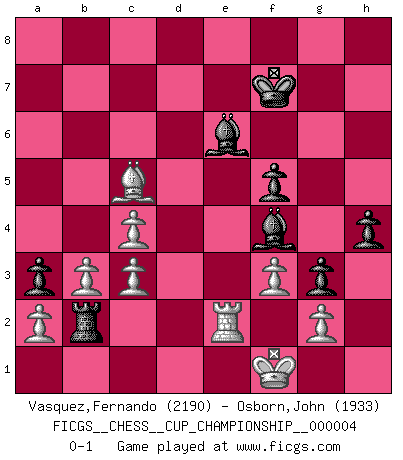Last move : 0-1 2021 December 8 10:29:58 [Event "FICGS__CHESS__CUP_CHAMPIONSHIP__000004"] [Site "FICGS"] [Date "2021.09.20"] [Round "1"] [White "Vasquez,Fernando"] [Black "Osborn,John"] [Result "0-1"] [WhiteElo "2190"] [BlackElo "1933"] 1.e4 e5 2.Nf3 Nf6 3.Nc3 Nc6 4.Bb5 Nd4 5.Nxd4 exd4 6.e5 dxc3 7.dxc3 Nd5 8.O-O c6 9.Bc4 d6 10.Bxd5 cxd5 11.Qxd5 dxe5 12.Qb5+ Qd7 13.Qxe5+ Qe6 14.Qb5+ Qc6 15.Re1+ Be6 16.Qxc6+ bxc6 17.Be3 Be7 18.Rad1 O-O 19.f3 a5 20.b3 a4 21.Re2 h5 22.Kf2 Rad8 23.Rxd8 Rxd8 24.Bb6 Rb8 25.Bd4 c5 26.Be5 Rd8 27.Ke1 Re8 28.c4 f6 29.Bg3 Kf7 30.h3 g5 31.h4 g4 32.Kf1 Rd8 33.Ke1 Rg8 34.Bf2 g3 35.Be3 f5 36.Kf1 Rc8 37.Bf4 Bxh4 38.Bd6 Rd8 39.Bxc5 Bg5 40.Bb6 Rd7 41.Ke1 h4 42.Bc5 Bc1 43.c3 Bf4 44.Kf1 Rd1+ 45.Re1 Rd3 46.Bd4 a3 47.Bc5 Rd2 48.Re2 Rb2 0-1 Petrov Three knights game Kingside Castling by player White (move 8) Kingside Castling by player Black (move 18) Player Black won this chess game. Follow this game move after move (download)The beauty of a move lies not in its' appearance but in the thought behind it. (Siegbert Tarrasch) Wenn ich mich einlogge, glauben die Leute gewöhnlich nicht, dass ich es selbst bin und sie fangen an, mir dumme Fragen zu stellen. Und wenn sie es glauben, stellen sie wieder andere dumme Fragen. (Judith Polgar) Fischer es el jugador mas fuerte del mundo. De hecho, el jugador mas fuerte que jamas haya existido. (Larry Evans) Seul un grand joueur sait à quel point il joue faiblement. (Xavier Tartacover) We need strong personalities and only one world champion to attract sponsors. (Anatoly Karpov)