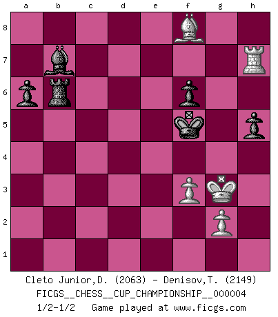 Last move : 1/2-1/2 2021 December 14 9:14:56 [Event "FICGS__CHESS__CUP_CHAMPIONSHIP__000004"] [Site "FICGS"] [Date "2021.09.20"] [Round "1"] [White "Cleto Junior,Dirceu"] [Black "Denisov,Timofey"] [Result "1/2-1/2"] [WhiteElo "2063"] [BlackElo "2149"] 1.d4 d5 2.c4 e6 3.Nc3 dxc4 4.e4 c5 5.d5 exd5 6.exd5 Bd6 7.Bxc4 Ne7 8.Nge2 O-O 9.Ne4 Nf5 10.O-O Bxh2+ 11.Kxh2 Qh4+ 12.Kg1 Qxe4 13.b3 Nd7 14.Bf4 Nb6 15.f3 Qe7 16.Re1 Qf6 17.Qd2 Nxc4 18.bxc4 Bd7 19.Ng3 Nxg3 20.Bxg3 Rfe8 21.Qf4 Qxf4 22.Bxf4 Ba4 23.Bd6 b6 24.Rxe8+ Rxe8 25.Kf2 f6 26.Rc1 Kf7 27.Rc3 a6 28.Kg3 Bd7 29.Ra3 Bc8 30.Kf2 Kg6 31.Rb3 b5 32.cxb5 Rd8 33.Be7 Rxd5 34.b6 Bb7 35.Rc3 Rd2+ 36.Kg3 Rxa2 37.Rxc5 Rb2 38.Rc7 Rxb6 39.Bf8 Kf5 40.Rxg7 h5 41.Rh7 1/2-1/2 QGD : 3.Nc3 Kingside Castling by player Black (move 8) Kingside Castling by player White (move 10) This chess game ended in a draw. Follow this game move after move (download)You may learn much more from a game you lose than from a game you win. You will have to lose hundreds of games before becoming a good player. (Jose Raul Capablanca) Wenn du gegen Bobby spielst, ist es keine Frage von gewinnen oder verlieren. Es ist eine Frage des Überlebens. (Boris Vassilievich Spassky) Los libros de Ajedrez deben de usarse igual como usamos los anteojos: para mejorar la vista, aunque algunos jugadores los quieren usar como si ellos les otorgaran la vision. (José Raúl Capablanca) Toutes choses étant égales, c'est la conviction qui gagne. Alliée à une volonté de vaincre, elle sert de détonateur, suscite des idées, disperse les doutes et aide à penser clairement. (Robert Fischer) When I took office, only high energy physicists had ever heard of what is called the World Wide Web... Now even my cat has its own page. (Bill Clinton, 1996)