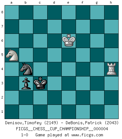 Last move : 1-0 2022 February 18 20:12:7 [Event "FICGS__CHESS__CUP_CHAMPIONSHIP__000004"] [Site "FICGS"] [Date "2021.09.20"] [Round "1"] [White "Denisov,Timofey"] [Black "DeBonis,Patrick"] [Result "1-0"] [WhiteElo "2149"] [BlackElo "2043"] 1.d4 Nf6 2.c4 e6 3.Nf3 d5 4.Nc3 c6 5.Bg5 dxc4 6.e4 b5 7.e5 h6 8.Bh4 g5 9.Nxg5 hxg5 10.Bxg5 Nbd7 11.g3 Rg8 12.h4 Rxg5 13.hxg5 Nd5 14.g6 fxg6 15.Qg4 Qe7 16.Bg2 N7b6 17.Qxg6+ Qf7 18.Be4 Qxg6 19.Bxg6+ Kd7 20.Rh7+ Be7 21.Ne4 Kc7 22.g4 Nd7 23.O-O-O Nf8 24.Rg7 Nxg6 25.Rxg6 Bd7 26.Rh1 c5 27.dxc5 Rf8 28.Rh7 Kd8 29.R6g7 Bc6 30.g5 Nf4 31.Nf6 Bxc5 32.Kd2 Bb6 33.Rh4 Nd3 34.f4 b4 35.b3 Bf2 36.R4h7 Nxf4 37.bxc4 Bd4 38.Rd7+ Bxd7 39.Rxd7+ Kc8 40.Rxd4 Ng6 41.Ke3 Nxe5 42.Re4 Nf7 43.Kf4 Nd8 44.Re2 Kb7 45.Kg4 Kc6 46.Kh5 Rh8+ 47.Kg6 Rh1 48.Kg7 a5 49.g6 a4 50.Kf8 Rh6 51.Ng4 Rxg6 52.Ne5+ Kc5 53.Nxg6 Nc6 54.Rxe6 b3 55.axb3 axb3 56.Re1 Kd4 57.c5 Na5 58.Nf4 Kxc5 59.Re5+ Kc4 60.Re2 Nc6 61.Re4+ Kc3 62.Re3+ Kc2 63.Re2+ Kc3 64.Nd5+ Kc4 65.Nb6+ Kb5 66.Nc8 Kc5 67.Rd2 Kb4 68.Nd6 Ka3 69.Rd3 Ne5 70.Re3 Ng4 71.Re4 Nf6 72.Nc4+ Kb4 73.Rh4 Kc3 74.Kf7 Nd5 75.Ke6 Nb4 76.Na5 1-0 Queen's pawn game Queenside Castling by player White (move 23) 10 pieces endgame at move 53 : White KRNPP , Black KNPPP WHITE : King + 1 Rook 1 Knight 2 Pawns BLACK : King + 1 Knight 3 Pawns 9 pieces endgame at move 54 : White KRNPP , Black KNPP WHITE : King + 1 Rook 1 Knight 2 Pawns BLACK : King + 1 Knight 2 Pawns 8 pieces endgame at move 55 : White KRNPP , Black KNP WHITE : King + 1 Rook 1 Knight 2 Pawns BLACK : King + 1 Knight 1 Pawn 7 pieces endgame at move 55 : White KRNP , Black KNP WHITE : King + 1 Rook 1 Knight 1 Pawn BLACK : King + 1 Knight 1 Pawn 6 pieces endgame at move 58 : White KRN , Black KNP WHITE : King + 1 Rook 1 Knight BLACK : King + 1 Knight 1 Pawn Player White won this chess game. Follow this game move after move (download)He who takes the Queen's Knight's Pawn will sleep in the streets. (Anonymous) Ich könnte leicht behaupten: Ja,ja, Leonid Breschnew wollte nicht, daß ich Weltmeister werde. In der Tat war die Sache komplizierter. (Viktor Kortschnoi) Bobby solo arroja las piezas y solas caen en las casillas correctas. (Miguel Najdorf ) Si le désir cupide (et stupide) de gagner est une inépuisable source de souffrance, une combinaison brillante sur l'échiquier est une découverte : le coquelicot qui s'épanouit lorsque apparaît la Voie Lactée. (Arrabal) Big Chess is a place for big hallucinations. (Thibault de Vassal)