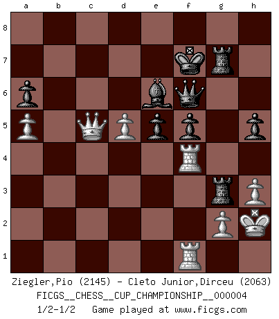 Last move : 1/2-1/2 2021 November 30 10:45:37 [Event "FICGS__CHESS__CUP_CHAMPIONSHIP__000004"] [Site "FICGS"] [Date "2021.09.20"] [Round "1"] [White "Ziegler,Pio"] [Black "Cleto Junior,Dirceu"] [Result "1/2-1/2"] [WhiteElo "2145"] [BlackElo "2063"] 1.d4 Nf6 2.c4 c5 3.d5 e6 4.Nc3 exd5 5.cxd5 d6 6.e4 g6 7.Nf3 Bg7 8.Nd2 O-O 9.Be2 Re8 10.O-O Nbd7 11.h3 a6 12.a4 b6 13.Qc2 Qe7 14.b3 Rb8 15.Bb2 g5 16.Nc4 Ne5 17.Nxe5 Qxe5 18.Rae1 Qe7 19.Nd1 b5 20.Bf3 Nd7 21.Bxg7 Kxg7 22.Bg4 bxa4 23.bxa4 Kf8 24.f4 gxf4 25.Bxd7 Bxd7 26.Rxf4 Qe5 27.Ref1 Re7 28.Qf2 Ke8 29.Qg3 Kd8 30.Nf2 h5 31.a5 f5 32.Nd3 Qf6 33.Kh2 Rg7 34.Qf2 Rb3 35.e5 dxe5 36.Nxc5 Rbg3 37.Ne6+ Bxe6 38.Qb6+ Ke7 39.Qc5+ Kf7 1/2-1/2 Benoni : Classical with e4 and Nf3 Kingside Castling by player Black (move 8) Kingside Castling by player White (move 10) This chess game ended in a draw. Follow this game move after move (download)All I want to do, ever, is just play Chess. (Bobby Fischer) Ohne ihre Erfolge schmälern zu wollen würde ich sagen Petrosian, Spassky und Karpov verdanken ihre Siege ihren Trainern - Boleslavsky, Bondarevsky und Furman. (Mikhail Moiseyevich Botvinik) El ganador de una partida es aquel jugador que hace el penúltimo error. (Savielly Tartakover) L'action d'une oeuvre littéraire se déroule sur un champ de bataille. Les masques et les types du drame moderne correspondent aux pièces du jeu d'échecs. L'intrigue correspond aux coups et aux gambits, c'est à dire aux techniques du jeu telles qu'utilisées et interprétées par les joueurs. Les tactiques et les péripéties [mouvements] correspondent aux coups exécutés par l'adversaire. (Viktor Shklovsky) Quotation,n.: The act of repeating erroneously the words of another. The words erroneously repeated. (Ambrose Bierce, The Devil's Dictionary)