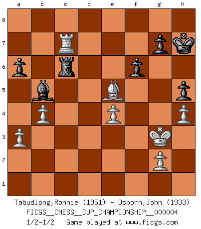 Last move : 1/2-1/2 2021 October 15 17:51:45 [Event "FICGS__CHESS__CUP_CHAMPIONSHIP__000004"] [Site "FICGS"] [Date "2021.09.20"] [Round "1"] [White "Tabudlong,Ronnie"] [Black "Osborn,John"] [Result "1/2-1/2"] [WhiteElo "1951"] [BlackElo "1933"] 1.d4 d5 2.c4 dxc4 3.Nf3 Nf6 4.e3 e6 5.Bxc4 a6 6.O-O c5 7.dxc5 Bxc5 8.Qxd8+ Kxd8 9.Be2 Ke7 10.Nc3 b5 11.Nd2 Bb7 12.Nb3 Nbd7 13.Nxc5 Nxc5 14.b4 Nce4 15.Bb2 Rac8 16.Nxe4 Nxe4 17.Rfc1 f6 18.f3 Rhd8 19.Kf1 Nd2+ 20.Ke1 e5 21.Rxc8 Bxc8 22.Rc1 Nc4 23.Bxc4 bxc4 24.Rxc4 Bd7 25.e4 Ba4 26.Rc7+ Kf8 27.Ra7 Rd1+ 28.Ke2 Rb1 29.Bc3 Bb5+ 30.Kf2 Bc4 31.Rc7 Bb5 32.Kg3 h5 33.h4 Kg8 34.f4 exf4+ 35.Kxf4 Rf1+ 36.Kg3 Rc1 37.a3 Kh7 38.Be5 Rc6 1/2-1/2 QGA : 4...e6 Kingside Castling by player White (move 6) This chess game ended in a draw. Follow this game move after move (download)The passion for playing Chess is one of the most unaccountable in the world. (H.G. Wells) Ein Gewinn durch eine ungenaue Kombination, sei sie auch noch so vorzeigbar, erfüllt mich mit Schaudern. (Wilhelm Steinitz) Me gusta decir que Bobby Fischer fue el mejor jugador que jamás haya existido. Pero lo que hizo de Fischer un genio, fue su habilidad de mezclar una frescura y pragmatismo Americano con ideas Rusas acerca de la estrategia. (Bruce Pandolfini) Les Echecs ont trois composantes : le temps, l'espace et le matériel en dernier. (Mikhail Tal) I've never seen so many men wasted so badly. (Blondie in The Good, The Bad and The Ugly)