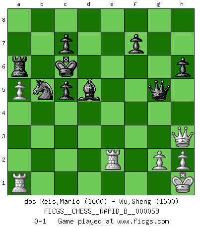 Last move : 0-1 2007 December 4 8:17:2 [Event "FICGS__CHESS__RAPID_B__000059"] [Site "FICGS"] [Date "2007.07.20"] [Round "1"] [White "dos Reis,Mario"] [Black "Wu,Sheng"] [Result "0-1"] [WhiteElo "1600"] [BlackElo "1600"] 1.e4 e5 2.f4 d5 3.exd5 exf4 4.Nf3 Nf6 5.Bc4 Nxd5 6.O-O Be6 7.Bxd5 Qxd5 8.d4 Nc6 9.Bxf4 O-O-O 10.c3 h6 11.Nbd2 g5 12.Bg3 Bg7 13.Kh1 Qd7 14.b4 Rhe8 15.b5 Ne7 16.Qa4 Nf5 17.Be5 g4 18.Bxg7 gxf3 19.Nxf3 Nxg7 20.Ne5 Qd5 21.Qxa7 b6 22.Nc6 Qxb5 23.Nxd8 Rxd8 24.Qa8+ Kd7 25.Qf3 Qd5 26.Qd3 Ra8 27.a4 Nf5 28.c4 Qxd4 29.Qf3 Qh8 30.Rfd1+ Nd6 31.c5 bxc5 32.a5 Ra6 33.Qa3 Qe5 34.Re1 Qg5 35.Qc3 Bd5 36.Re2 Nb5 37.Qh3+ Kc6 0-1 This chess game has been lost on time (started : 2007.07.20 17:6:11) KGD : Falkbeer counter-gambit Kingside Castling by player White (move 6) Queenside Castling by player Black (move 9) Player Black won this chess game. Follow this game move after move (download)Though most people love to look at the games of the great attacking masters, some of the most successful players in history have been the quiet positional players. They slowly grind you down by taking away your space, tying up your pieces, and leaving you with virtually nothing to do ! (Yasser Seirawan) Frage des Reporters: -Welche besonderen Umstände rechtfertigen das Anhalten der Uhren während einer Turnierpartie? Antwort: -Einen Fotographen zu strangulieren. (Siegbert Tarrasch) Cuando tengo las piezas blancas, yo gano porque soy blanco; Cuando tengo las piezas negras, yo gano porque soy Bogolyubov. (Bogolyubov) Comme les marins qui ont mille raisons différentes d'aller en mer, les joueurs d'échecs en ont tout autant avant de s'installer devant une table et jouer... (Vincent Bertignac, philosophe) The difference between perseverance and obstinacy is that one comes from a strong will, and the other from a strong won't. (Henry Ward Beecher)