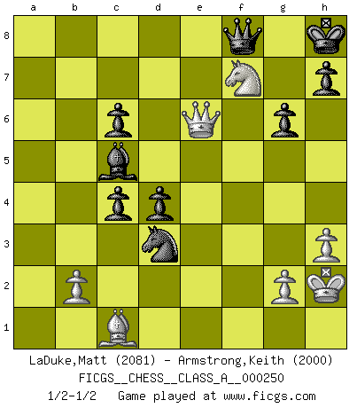 Last move : 1/2-1/2 2021 October 30 23:37:54 [Event "FICGS__CHESS__CLASS_A__000250"] [Site "FICGS"] [Date "2021.09.22"] [Round "1"] [White "LaDuke,Matt"] [Black "Armstrong,Keith"] [Result "1/2-1/2"] [WhiteElo "2081"] [BlackElo "2000"] 1.e4 e5 2.Nf3 Nc6 3.Bb5 a6 4.Ba4 Nf6 5.O-O Be7 6.Re1 b5 7.Bb3 O-O 8.h3 Bb7 9.d3 d5 10.exd5 Nxd5 11.a4 Nd4 12.Nbd2 Nxb3 13.Nxb3 f6 14.Na5 Qc8 15.Nxb7 Qxb7 16.Nh4 Bc5 17.Nf5 c6 18.Qg4 g6 19.axb5 axb5 20.Rxa8 Rxa8 21.c4 Nb4 22.Nh6+ Kh8 23.d4 exd4 24.Qf3 Rf8 25.Re6 bxc4 26.Rxf6 Qe7 27.Rxf8+ Qxf8 28.Qe2 Nd3 29.Qe6 Qxf2+ 30.Kh2 Qf8 31.Nf7+ Kg8 32.Nd6 Kh8 33.Nf7+ Kg8 34.Nd6 Kh8 35.Nf7+ 1/2-1/2 Ruy Lopez : Closed, 7...O-O Kingside Castling by player White (move 5) Kingside Castling by player Black (move 7) This chess game ended in a draw. Follow this game move after move (download)You must take your opponent into a deep dark forest where 2+2=5, and the path leading out is only wide enough for one. (Mikhail Tal) Wer nie einen Fehler gemacht hat, hat nie etwas Neues ausprobiert. (Albert Einstein) La caracteristica mas importante en la posición del Ajedrez es la actividad de las piezas. Esto es absolutamente fundamental en todas las fases del juego: Apertura, Juego Medio y especialmente Finales. La limitación primordial en la actividad de una pieza, es la estructuración de los Peones. (Michael Stean) Il n'y a pas de prix trop élevé au scalp de l'ennemi. (Koblentz) I'm extremely disappointed. I send you out for exciting, new designer drugs, you come back with tomato sauce. (Gregory House, House M.D.)