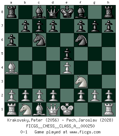 Last move : 0-1 2021 November 29 19:5:21 [Event "FICGS__CHESS__CLASS_A__000250"] [Site "FICGS"] [Date "2021.09.22"] [Round "1"] [White "Krakovsky,Peter"] [Black "Pech,Jaroslav"] [Result "0-1"] [WhiteElo "2056"] [BlackElo "2028"] 1.e4 e5 2.Nf3 Nc6 3.Bb5 a6 4.Ba4 Nf6 0-1 This chess game has been lost on time (started : 2021.09.22 12:7:25) Ruy Lopez : Morphy defense Player Black won this chess game. Follow this game move after move (download)It is not a move, even the best move that you must seek, but a realizable plan. (Eugene Znosko-Borovsky) Vom Schach wurde gesagt das Leben sei dafür nicht lange genug. Aber das ist der Fehler des Lebens, nicht des Schach'. (Irving Chernev) Los Peones son nacidos libres, y aún así, se encuentran encadenados por todos lados. (Rick Kennedy) A chaque perte on perd un peu de soi. (Joël Lautier) If you have any trouble condescending, find a Unix user to show you how it's done. (Scott Adams)