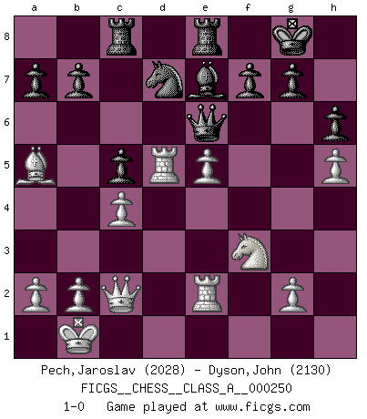 Last move : 1-0 2022 July 15 6:46:25 [Event "FICGS__CHESS__CLASS_A__000250"] [Site "FICGS"] [Date "2021.09.22"] [Round "1"] [White "Pech,Jaroslav"] [Black "Dyson,John"] [Result "1-0"] [WhiteElo "2028"] [BlackElo "2130"] 1.e4 c6 2.d4 d5 3.Nc3 dxe4 4.Nxe4 Bf5 5.Ng3 Bg6 6.h4 h6 7.Nf3 Nd7 8.h5 Bh7 9.Bd3 Bxd3 10.Qxd3 e6 11.Bf4 Qa5+ 12.Bd2 Bb4 13.c3 Be7 14.c4 Qc7 15.O-O-O Ngf6 16.Kb1 O-O 17.Rhe1 Rad8 18.Qc2 Ng4 19.Nf5 Bf6 20.Re2 c5 21.Ne3 Nxe3 22.fxe3 Rfe8 23.Be1 Rc8 24.d5 exd5 25.Rxd5 Qc6 26.e4 Qe6 27.e5 Be7 28.Ba5 1-0 This chess game has been lost on time (started : 2021.09.22 12:7:25) Caro-Kann : Classical, 7...Nd7 Queenside Castling by player White (move 15) Kingside Castling by player Black (move 16) Player White won this chess game. Follow this game move after move (download)When your house is on fire, you can't be bothered with the neighbors. Or, as we say in Chess, if your King is under attack you don't worry about losing a Pawn on the Queen's side. (Gary Kasparov) Ich trinke, ich rauche, ich spiele, ich liebe Frauen aber Fernschach ist ein Laster, das ich nicht habe. (Mikhail Nekhemyevich Tal) Si un gobernante no entiende al Ajedrez, ¿como puede governar él un reinado?. (El Rey Khusros II) En blitz, le Cavalier l'emporte sur le Fou. (Vlastimil Hort) He who laughs last probably does not get the joke. (Unknown)