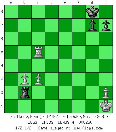 Last move : 1/2-1/2 2022 January 18 14:34:13 [Event "FICGS__CHESS__CLASS_A__000250"] [Site "FICGS"] [Date "2021.09.22"] [Round "1"] [White "Dimitrov,George"] [Black "LaDuke,Matt"] [Result "1/2-1/2"] [WhiteElo "2157"] [BlackElo "2081"] 1.e4 e5 2.Nf3 Nc6 3.Bb5 a6 4.Ba4 Nf6 5.O-O Nxe4 6.d4 b5 7.Bb3 d5 8.dxe5 Be6 9.c3 Bc5 10.Nbd2 O-O 11.Bc2 Bxf2+ 12.Rxf2 Nxf2 13.Kxf2 f6 14.exf6 Qxf6 15.Nf1 Rae8 16.Be3 Ne5 17.Bc5 Nxf3 18.gxf3 Rf7 19.Kg2 Qg5+ 20.Kh1 d4 21.Bxd4 Bd5 22.Bb3 c5 23.Be3 Bxb3 24.axb3 Rxe3 25.Nxe3 Qxe3 26.Rxa6 Qxf3+ 27.Qxf3 Rxf3 28.Ra5 Rf2 29.Rxb5 Rxb2 30.Rxc5 1/2-1/2 Ruy Lopez : Open, 7.Bb3 Kingside Castling by player White (move 5) Kingside Castling by player Black (move 10) 10 pieces endgame at move 29 : White KRPPP , Black KRPPP WHITE : King + 1 Rook 3 Pawns BLACK : King + 1 Rook 3 Pawns 9 pieces endgame at move 30 : White KRPPP , Black KRPP WHITE : King + 1 Rook 3 Pawns BLACK : King + 1 Rook 2 Pawns This chess game ended in a draw. Follow this game move after move (download)The combination player thinks forward; he starts from the given position, and tries the forceful moves in his mind. (Emanuel Lasker) Ich las kürzlich ein Buch von Nietzsche. Er sagte Religion verdumme nur die Menschen. Ich stimme zu. (Robert James Fischer) Algunos sacrificios son sólidos, los demás son míos. (Mikhail Tal) Tous ces prétendus hommes politiques sont les pions, les Cavaliers, les Tours ou les Fous d'une partie d'échecs qui se jouera tant qu'un hasard ne renversera pas l'échiquier. (Honoré de Balzac) He who defends everything defends nothing. (Frederick the Great)