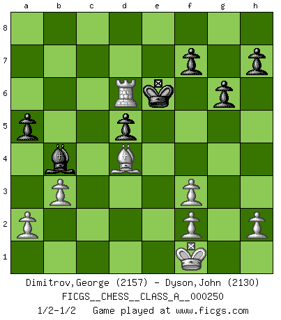 Last move : 1/2-1/2 2022 April 12 22:21:0 [Event "FICGS__CHESS__CLASS_A__000250"] [Site "FICGS"] [Date "2021.09.22"] [Round "1"] [White "Dimitrov,George"] [Black "Dyson,John"] [Result "1/2-1/2"] [WhiteElo "2157"] [BlackElo "2130"] 1.e4 c6 2.d4 d5 3.exd5 cxd5 4.c4 Nf6 5.Nc3 Nc6 6.Nf3 Bg4 7.cxd5 Nxd5 8.Qb3 Bxf3 9.gxf3 e6 10.Qxb7 Nxd4 11.Bb5+ Nxb5 12.Qc6+ Ke7 13.Qxb5 Qd7 14.Nxd5+ Qxd5 15.Qxd5 exd5 16.O-O Ke6 17.Re1+ Kf5 18.Be3 Be7 19.Rac1 Bf6 20.Rc5 Rhd8 21.b3 Rac8 22.Rec1 Rxc5 23.Rxc5 Be5 24.Ra5 Bc3 25.Rc5 Bb4 26.Rb5 a5 27.Bd4 g6 28.Kf1 Ke6 29.Rb6+ Rd6 30.Rxd6+ 1/2-1/2 Caro-Kann : Panov-Botvinnik attack Kingside Castling by player White (move 16) This chess game ended in a draw. Follow this game move after move (download)Adequate compensation for a sacrifice is having a sound combination leading to a winning position; adequate compensation for a blunder is having your opponent snatch defeat from the jaws of victory. (Bruce A. Moon) Irgendwie scheint mir sonntags früh um 9 Uhr der Killerinstinkt verloren gegangen zu sein. (Alexej Shirov) La esencia del Ajedrez es pensar acerca de lo que el Ajedrez es. (David Bronstein) Tout change constamment, y compris dans le monde des Echecs. (Botvinnik) I can't decide which is riskier; taking crazy risks, or taking advice on crazy risks from a crazy risk taker. (Gregory House in House M.D.)
