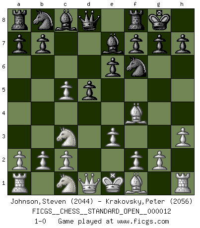 Last move : 1-0 2021 November 9 12:27:9 [Event "FICGS__CHESS__STANDARD_OPEN__000012"] [Site "FICGS"] [Date "2021.09.23"] [Round "2"] [White "Johnson,Steven"] [Black "Krakovsky,Peter"] [Result "1-0"] [WhiteElo "2044"] [BlackElo "2056"] 1.d4 d5 2.Nc3 Nf6 3.Bf4 e6 4.e3 Bb4 5.Nge2 O-O 6.h3 Be7 7.Nc1 c5 8.dxc5 1-0 This chess game has been lost on time (started : 2021.09.23 11:41:17) Queen's pawn : Chigorin variation Kingside Castling by player Black (move 5) Player White won this chess game. Follow this game move after move (download)There are two classes of men; those who are content to yield to circumstances and who play whist; those who aim to control circumstances, and who play Chess. (Mortimer Collins) Ein bischen Romantik kann weder im Schach noch in der Liebe schaden. Also versuche ich mich ab und zu daran zu erinnern. (Nigel Short) Aquellos que dicen que entienden al Ajedrez, no entienden nada. (Robert Hubner) Le génie consiste à savoir transgresser les règles au moment opportun. (Teichmann) The various flowers seem good to different people. (Chinese proverb)