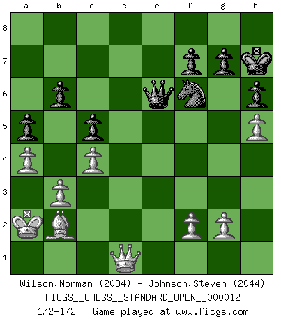 Last move : 1/2-1/2 2022 January 11 23:1:23 [Event "FICGS__CHESS__STANDARD_OPEN__000012"] [Site "FICGS"] [Date "2021.09.23"] [Round "2"] [White "Wilson,Norman"] [Black "Johnson,Steven"] [Result "1/2-1/2"] [WhiteElo "2084"] [BlackElo "2044"] 1.e4 c6 2.d4 d5 3.Nc3 dxe4 4.Nxe4 Bf5 5.Ng3 Bg6 6.h4 h6 7.Nf3 Nd7 8.h5 Bh7 9.Bd3 Ngf6 10.Bxh7 Nxh7 11.Qe2 e6 12.Bd2 Ndf6 13.O-O-O Be7 14.Kb1 O-O 15.c4 Qc7 16.Ne5 Rad8 17.Bf4 Qc8 18.Be3 Rfe8 19.Rd2 Nf8 20.Rhd1 N8d7 21.Qf3 c5 22.Nxd7 Nxd7 23.d5 exd5 24.Rxd5 Nf6 25.Rxd8 Rxd8 26.Rxd8+ Bxd8 27.b3 b6 28.Bd2 Bc7 29.Ne4 Ng4 30.Nc3 Bd8 31.a4 Bg5 32.Nd5 Qd7 33.Bc3 Qe6 34.Ka2 Bf6 35.Nxf6+ Nxf6 36.Bb2 a5 37.Qd1 Kh7 38.Qd3+ Kh8 39.Qd8+ Kh7 40.Qd1 1/2-1/2 Caro-Kann : Classical, 7...Nd7 Queenside Castling by player White (move 13) Kingside Castling by player Black (move 14) This chess game ended in a draw. Follow this game move after move (download)Checkers is for tramps. (Paul Morphy) Man wirke der falschen Auffassung entgegen, als ob jeder Zug Unmittelbares zu leisten habe; auch Werte- und Ruhezüge haben ihre Existenzberechtigung. (Aaron Nimzowitsch) Hay dos clases de hombres: aquellos que se conforman en dejarse llevar por las circunstancias y que juegan barajas y aquellos decididos a controlar las circunstancias y que juegan al Ajedrez. (Mortimer Collins) Je ne crois pas en la psychologie, je crois aux bons coups. (Robert Fischer) No, I am still playing. (Anatoly Karpov)