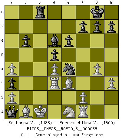 Last move : 0-1 2007 July 24 9:17:26 [Event "FICGS__CHESS__RAPID_B__000059"] [Site "FICGS"] [Date "2007.07.20"] [Round "1"] [White "Sakharov,Vitalij"] [Black "Perevozchikov,Vjacheslav"] [Result "0-1"] [WhiteElo "1438"] [BlackElo "1600"] 1.e4 c6 2.d4 d5 3.exd5 cxd5 4.Be3 Nf6 5.Nf3 Nc6 6.c3 Bg4 7.Nbd2 e6 8.Bd3 Bd6 9.Qc2 O-O 10.h3 Bh5 11.g4 Bg6 12.O-O-O Nb4 13.Bxg6 Nxc2 14.Bxc2 Qc7 15.Nb3 a5 16.Rhf1 a4 17.Nc5 a3 18.b3 b6 19.Na4 Rxa4 20.bxa4 Qxc3 21.Ne1 Ne4 22.Rd3 Qa1+ 23.Bb1 Rc8+ 0-1 Caro-Kann : Exchange variation Kingside Castling by player Black (move 9) Queenside Castling by player White (move 12) Player Black won this chess game. Follow this game move after move (download)I'd rather have a Pawn than a finger. (Reuben Fine) Ich erzeugte keinen Neid, da mich die Schachspieler als Musiker und die Musiker als Schachspieler betrachteten. (Mark Taimanov) Realmente no sabemos como el juego fue inventado, aunque hay sospechas. Tan pronto como descubramos a los culpables, se los haremos saber. (Bruce Pandolfini) J'apprécie les joueurs d'est-indienne, c'est grâce à eux que je nourris ma famille depuis tant d'années. (Petrosian) No, I am still playing. (Anatoly Karpov)
