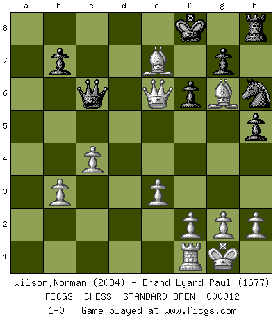 Last move : 1-0 2021 October 8 9:36:55 [Event "FICGS__CHESS__STANDARD_OPEN__000012"] [Site "FICGS"] [Date "2021.09.23"] [Round "1"] [White "Wilson,Norman"] [Black "Brand Lyard,Paul"] [Result "1-0"] [WhiteElo "2084"] [BlackElo "1677"] 1.c4 e5 2.Nc3 Bb4 3.Nd5 a5 4.Nf3 c6 5.Nxb4 axb4 6.Nxe5 d6 7.Nd3 c5 8.b3 Bf5 9.Bb2 f6 10.e3 Bxd3 11.Bxd3 Nc6 12.O-O h5 13.Bg6+ Kf8 14.d4 Qe7 15.a3 bxa3 16.Rxa3 Rxa3 17.Bxa3 Nh6 18.dxc5 dxc5 19.Qd5 Qe8 20.Bxc5+ Ne7 21.Qe6 Qc6 22.Bxe7+ 1-0 English, Kramnik-Shirov counterattack Kingside Castling by player White (move 12) Player White won this chess game. Follow this game move after move (download)The tactician must know what to do whenever something needs doing; the strategist must know what to do when nothing needs doing. (Savielly Tartakover) Was ist der Unterschied zwischen einem Strassenarbeiter und einem Schachspieler? --Der Schachspieler bewegt sich ab und zu. (Anonymous) La belleza de un movimiento no se refleja solo en su apariencia, sino en el pensamiento detrás de él. (Siegbert Tarrasch) Je ne suis pas le dernier à jouer lâchement des coups douteux pendant le zeïtnot de l'adversaire pour l'achever: en effet les coups qui font le plus peur sont ceux que l'on ne comprend pas. Je me fais souvent peur quand je joue. (Un professeur anonyme) As a goal marker shodan is important. As a destination it is a poor place to stop. (Thomas Tamayo)