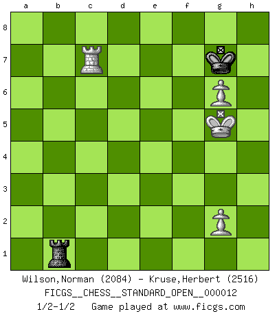 Last move : 1/2-1/2 2022 January 14 12:32:31 [Event "FICGS__CHESS__STANDARD_OPEN__000012"] [Site "FICGS"] [Date "2021.09.23"] [Round "1"] [White "Wilson,Norman"] [Black "Kruse,Herbert"] [Result "1/2-1/2"] [WhiteElo "2084"] [BlackElo "2516"] 1.e4 c6 2.d4 d5 3.Nc3 dxe4 4.Nxe4 Bf5 5.Ng3 Bg6 6.h4 h6 7.Nf3 Nd7 8.h5 Bh7 9.Bf4 e6 10.Bd3 Bxd3 11.Qxd3 Qa5+ 12.Bd2 Bb4 13.c3 Be7 14.c4 Qc7 15.d5 cxd5 16.cxd5 Qd6 17.Qb5 Ngf6 18.dxe6 Qxe6+ 19.Kf1 a6 20.Qxb7 Rb8 21.Qc7 Bd6 22.Qc6 O-O 23.Re1 Rb6 24.Rxe6 Rxc6 25.Re2 Rb8 26.Bc3 Bxg3 27.fxg3 Rc5 28.Rh4 Nxh5 29.Kf2 Nhf6 30.Ne5 Nxe5 31.Bxe5 Rb6 32.Rf4 Re6 33.Bxf6 gxf6 34.Rxe6 fxe6 35.Rxf6 Rc2+ 36.Kf3 Rxb2 37.Rxe6 Rxa2 38.Rxh6 a5 39.Rb6 a4 40.g4 a3 41.Rb7 Ra1 42.Ra7 a2 43.Kg3 Kf8 44.Ra8+ Kf7 45.g5 Kg6 46.Kg4 Kg7 47.Ra6 Kf7 48.g6+ Kg7 49.Kg5 Kg8 50.Ra7 Kh8 51.Ra8+ Kg7 52.Ra5 Kh8 53.Ra6 Kg7 54.Ra8 Rb1 55.Ra7+ Kg8 56.Rxa2 Kg7 57.Ra7+ Kg8 58.Ra6 Kg7 59.Ra7+ Kg8 60.Re7 Ra1 61.Re8+ Kg7 62.Re7+ Kg8 63.Re8+ Kg7 64.Re5 Rb1 65.Re7+ Kg8 66.Rf7 Ra1 67.Rc7 Rb1 68.Rc8+ Kg7 69.Rc7+ 1/2-1/2 Caro-Kann : Classical, 7...Nd7 Kingside Castling by player Black (move 22) 10 pieces endgame at move 36 : White KRPPP , Black KRPPP WHITE : King + 1 Rook 3 Pawns BLACK : King + 1 Rook 3 Pawns 9 pieces endgame at move 37 : White KRPPP , Black KRPP WHITE : King + 1 Rook 3 Pawns BLACK : King + 1 Rook 2 Pawns 8 pieces endgame at move 37 : White KRPP , Black KRPP WHITE : King + 1 Rook 2 Pawns BLACK : King + 1 Rook 2 Pawns 7 pieces endgame at move 38 : White KRPP , Black KRP WHITE : King + 1 Rook 2 Pawns BLACK : King + 1 Rook 1 Pawn 6 pieces endgame at move 56 : White KRPP , Black KR WHITE : King + 1 Rook 2 Pawns BLACK : King + 1 Rook This chess game ended in a draw. Follow this game move after move (download)I like to say that Bobby Fischer was the greatest player ever. But what made Fischer a genius was his ability to blend an American freshness and pragmatism with Russian ideas about strategy. (Bruce Pandolfini) Vom Schach wurde gesagt das Leben sei dafür nicht lange genug. Aber das ist der Fehler des Lebens, nicht des Schach'. (Irving Chernev) Aquellos que dicen que entienden al Ajedrez, no entienden nada. (Robert Hubner) Il s'avisa de me proposer d'apprendre les échecs qu'il jouait un peu... me voilà forcené des échecs. J'achète un échiquier, je m'enferme dans ma chambre, j'y passe des jours et des nuits à vouloir apprendre par cur toutes les parties. (Jean-Jacques Rousseau, Confessions) Experiences are the keys to life. (Daniel Parmet)