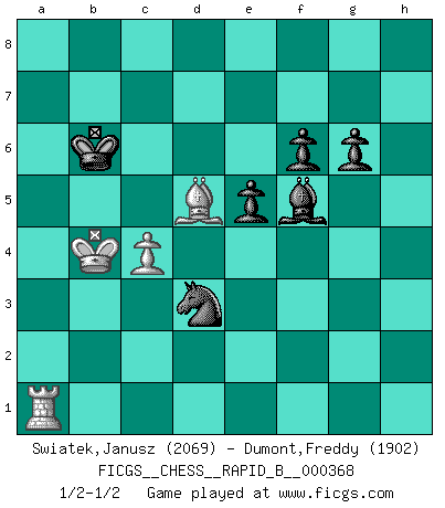 Last move : 1/2-1/2 2021 November 1 21:48:22 [Event "FICGS__CHESS__RAPID_B__000368"] [Site "FICGS"] [Date "2021.09.24"] [Round "1"] [White "Swiatek,Janusz"] [Black "Dumont,Freddy"] [Result "1/2-1/2"] [WhiteElo "2069"] [BlackElo "1902"] 1.e4 c5 2.Nf3 d6 3.d4 cxd4 4.Nxd4 Nf6 5.Nc3 e6 6.g4 h6 7.Rg1 Nc6 8.Be3 a6 9.h4 h5 10.gxh5 Nxh5 11.Qd2 Bd7 12.Be2 b5 13.a3 Nf6 14.O-O-O Qb8 15.h5 b4 16.axb4 Qxb4 17.Nb3 a5 18.f4 a4 19.Nd4 Nxd4 20.Qxd4 Qxd4 21.Rxd4 a3 22.bxa3 Rxa3 23.Kd2 Ra8 24.Rg5 Nh7 25.Rg3 Nf6 26.Rg5 Nh7 27.Rg1 Nf6 28.e5 Nxh5 29.Bf3 Rd8 30.Rh1 dxe5 31.fxe5 g6 32.Ne4 Bg7 33.Bg5 Bxe5 34.Nf6+ Bxf6 35.Bxf6 Nxf6 36.Rxh8+ Ke7 37.Rxd8 Kxd8 38.Rd3 Kc7 39.Ra3 Kb6 40.Kd3 e5 41.c4 Bf5+ 42.Kc3 Ne4+ 43.Kb4 Nc5 44.Bd5 f6 45.Ra1 Nd3+ 46.Kc3 Nf4 47.Kb4 Nd3+ 48.Kc3 Nf4 49.Kb4 Nd3+ 1/2-1/2 Sicilian : Scheveningen, Keres attack Queenside Castling by player White (move 14) 10 pieces endgame at move 37 : White KRBP , Black KBNPPP WHITE : King + 1 Rook 1 Bishop 1 Pawn BLACK : King + 1 Bishop 1 Knight 3 Pawns This chess game ended in a draw. Follow this game move after move (download)Chess is a terrible game. If you have no center, your opponent has a freer position. If you do have a center, then you really have something to worry about ! (Siegbert Tarrasch) Die Idee von Capablanca, Schach als Fach in den Schulen zu lehren, ist großartig. (Fidel Castro) En la perfecta combinación de Ajedrez como en una historia corta de primera clase, toda la trama y contra trama deberá conducir hacia un final sorprendente, el interes no es mitigado hasta el último momento. (Yates and Winter) A ce moment-là , je menaçais de comprendre la position ! (Clément L'Heureux) Empty your mind, be formless, shapeless — like water. (Bruce Lee)