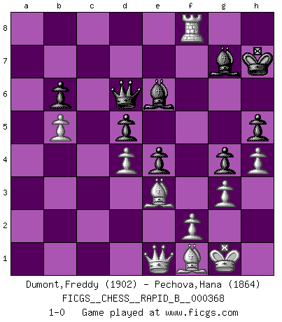 Last move : 1-0 2022 March 19 14:28:17 [Event "FICGS__CHESS__RAPID_B__000368"] [Site "FICGS"] [Date "2021.09.24"] [Round "1"] [White "Dumont,Freddy"] [Black "Pechova,Hana"] [Result "1-0"] [WhiteElo "1902"] [BlackElo "1864"] 1.e4 e6 2.Qe2 c5 3.Nf3 Nc6 4.g3 g6 5.Bg2 Bg7 6.c3 Nge7 7.O-O O-O 8.Na3 d6 9.Nc2 e5 10.d3 h6 11.Be3 f5 12.exf5 Bxf5 13.Nh4 Bd7 14.b4 g5 15.Nf3 cxb4 16.Nxb4 Nxb4 17.cxb4 Bg4 18.h3 Bf5 19.a4 Qd7 20.h4 g4 21.Nd2 d5 22.Nb3 b6 23.Qd2 Qd6 24.d4 e4 25.Bf4 Qg6 26.Nc1 Rac8 27.Ne2 Nc6 28.Be3 Qd6 29.Rfb1 h5 30.Nf4 Bg6 31.Bf1 Rcd8 32.Rc1 Rxf4 33.Rxc6 Qxc6 34.Bxf4 Rf8 35.a5 Qf6 36.Be3 Be8 37.axb6 axb6 38.b5 Qd8 39.Qa2 Kh7 40.Qa3 Rf7 41.Qc1 Bd7 42.Ra7 Be8 43.Ra6 Qf6 44.Qd2 Bd7 45.Qa2 Qd6 46.Ra8 Be6 47.Qc2 Rc7 48.Qd1 Rf7 49.Qe1 Rf8 50.Rxf8 1-0 French : Chigorin variation Kingside Castling by player White (move 7) Kingside Castling by player Black (move 7) Player White won this chess game. Follow this game move after move (download)The defensive power of a pinned piece is only imaginary. (Aaron Nimzovich) Ich bewundere Kasparows phantasievolle Angriffssiege aus den Achtzigern und Neunzigern, aber wenn man sie mit dem Computer überprüft, nimmt der Computer in jeder zweiten Partie die Opfer an, verteidigt sich und gewinnt. (Vladimir Kramnik) Bobby Fischer es el mas grande genio de Ajedrez de todos los tiempos. (Alexander Kotov) Plusieurs personnes se sont demandées comment Tal faisait pour gagner... En fait, c'est très simple ! Il met ses pièces au centre de l'échiquier et les sacrifie quelque part ! (David Bronstein) Memory is a crazy woman that hoards colored rags and throws away food. (Austin O'Malley)