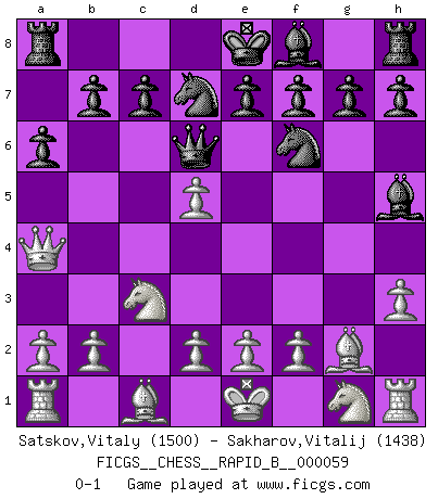 Last move : 0-1 2007 August 27 11:51:21 [Event "FICGS__CHESS__RAPID_B__000059"] [Site "FICGS"] [Date "2007.07.20"] [Round "1"] [White "Satskov,Vitaly"] [Black "Sakharov,Vitalij"] [Result "0-1"] [WhiteElo "1500"] [BlackElo "1438"] 1.g4 d5 2.Bg2 Bxg4 3.c4 Nf6 4.cxd5 Qd6 5.Nc3 Nbd7 6.h3 Bh5 7.Qa4 a6 0-1 This chess game has been lost on time (started : 2007.07.20 17:6:11) Grob : Fritz gambit Player Black won this chess game. Follow this game move after move (download)All Chess players should have a hobby. (Savielly Tartakower) Gegen einen Schachcomputer zu verlieren ist wie Löcher in den Strümpfen zuhaben. Es ist nicht peinlich, solange man der einzige ist der es weiß. (Anonymous) La pasion por jugar al Ajedrez es una de las mas inexplicables en el mundo. (H.G. Wells) La conception d'un plan est le processus par lequel un joueur exploite les avantages de sa position tout en s'efforçant d'en réduire au minimum les inconvénients. Afin de garantir le succès, un plan doit toujours se fonder sur un diagnostic objectif des particularités d'une position. La conception d'un plan est d'autant plus difficile que la position est équilibrée, et grandement facilitée lorsqu'il n'existe qu'un seul plan susceptible de répondre aux exigences de la position. (Harry Golombek) If only faces could talk... (Pat Summerall, Sportscaster during the Super Bowl)