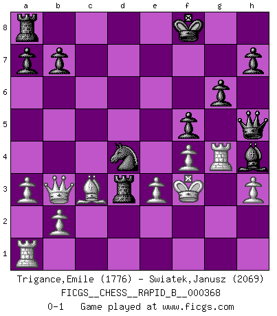 Last move : 0-1 2021 November 15 15:4:26 [Event "FICGS__CHESS__RAPID_B__000368"] [Site "FICGS"] [Date "2021.09.24"] [Round "1"] [White "Trigance,Emile"] [Black "Swiatek,Janusz"] [Result "0-1"] [WhiteElo "1776"] [BlackElo "2069"] 1.Nf3 c5 2.c4 Nf6 3.d4 cxd4 4.Nxd4 e6 5.Nc3 d5 6.cxd5 Nxd5 7.Bd2 Be7 8.Nb3 O-O 9.Nxd5 Qxd5 10.Bc3 Qf5 11.Nd4 Qg6 12.e3 e5 13.Nb5 Nc6 14.g3 Rd8 15.Qc1 Qe4 16.Rg1 Bg4 17.Be2 Bxe2 18.Kxe2 Qd3+ 19.Ke1 Qxb5 20.a3 Bf6 21.f4 Rd3 22.Kf2 exf4 23.gxf4 Bh4+ 24.Kf3 g6 25.Rg4 Qh5 26.Qc2 f5 27.Qb3+ Kf8 28.h3 Nd4+ 0-1 Reti Opening Kingside Castling by player Black (move 8) Player Black won this chess game. Follow this game move after move (download)Whoever sees no other aim in the game than that of giving checkmate to one's opponent will never become a good Chess player. (Euwe) Ich spiele ehrlich und spiele, um zu gewinnen. Wenn ich verliere nehme ich meine Medizin. (Robert James Fischer) Con o sin el título, Bobby Fischer fue sin lugar a dudas el mas grande jugador de su época. (Burt Hochberg) Il s'avisa de me proposer d'apprendre les échecs qu'il jouait un peu... me voilà forcené des échecs. J'achète un échiquier, je m'enferme dans ma chambre, j'y passe des jours et des nuits à vouloir apprendre par cur toutes les parties. (Jean-Jacques Rousseau, Confessions) A mistake is only a mistake if you let it happen twice. Otherwise it is a learning experience. (Daniel Parmet)