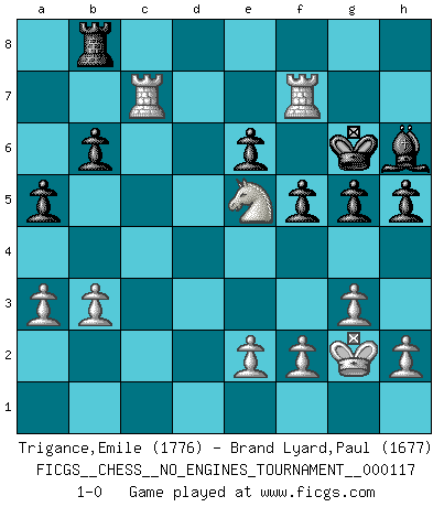 Last move : 1-0 2021 October 5 17:39:25 [Event "FICGS__CHESS__NO_ENGINES_TOURNAMENT__000117"] [Site "FICGS"] [Date "2021.09.26"] [Round "1"] [White "Trigance,Emile"] [Black "Brand Lyard,Paul"] [Result "1-0"] [WhiteElo "1776"] [BlackElo "1677"] 1.Nf3 d5 2.c4 dxc4 3.Qa4+ Qd7 4.Qxc4 e6 5.g3 g6 6.Qc3 Nf6 7.Qxf6 h5 8.Qxh8 Nc6 9.b3 Nb4 10.Qb2 Bc5 11.a3 Nd5 12.Nc3 Nxc3 13.Qxc3 b6 14.Bg2 Rb8 15.Bb2 f5 16.Qh8+ Bf8 17.Bg7 Qxg7 18.Qxg7 Bxg7 19.Rc1 Kd8 20.Rc6 Bd7 21.Rc2 c5 22.O-O Bc6 23.Ng5 Bxg2 24.Kxg2 Ke7 25.Rfc1 Kf6 26.Nf3 Rh8 27.d4 Bh6 28.Rd1 Rd8 29.Rd3 cxd4 30.Rxd4 Rb8 31.Rd7 a5 32.R2c7 g5 33.Rf7+ Kg6 34.Ne5+ 1-0 Reti accepted Kingside Castling by player White (move 22) Player White won this chess game. Follow this game move after move (download)There are tough players and nice guys, and I'm a tough player. (Bobby Fischer) Der beste Spieler in einem Turnier gewinnt es nie. Er landet auf Platz zwei oder drei. (Siegbert Tarrasch) La mitad de las variaciones que son calculadas en una partida de torneo, resultan ser completamente superfluas. Desafortunadamente, nadie sabe por adelantado cual mitad. (Jan Tinman) La tactique, c'est ce que vous faites quand il y a quelque chose à faire; la stratégie, c'est ce que vous faites quand il n'y a rien à faire. (Savielli Tartacower) Life is like a game of cards: the hand you are dealt represents determinism; the way you play it is free will. (Jawaharlal Nehru)