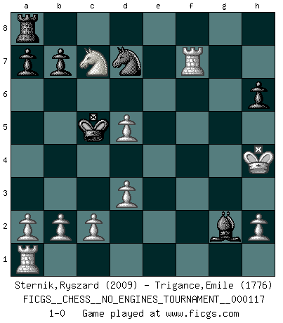 Last move : 1-0 2021 December 6 16:23:23 [Event "FICGS__CHESS__NO_ENGINES_TOURNAMENT__000117"] [Site "FICGS"] [Date "2021.09.26"] [Round "1"] [White "Sternik,Ryszard"] [Black "Trigance,Emile"] [Result "1-0"] [WhiteElo "2009"] [BlackElo "1776"] 1.e4 e5 2.f4 exf4 3.Nf3 Be7 4.Bc4 Bh4+ 5.Kf1 d5 6.Bxd5 Nf6 7.Nxh4 Nxd5 8.exd5 Qxh4 9.Qe2+ Qe7 10.d3 Qxe2+ 11.Kxe2 Bg4+ 12.Kf2 g5 13.g3 fxg3+ 14.Kxg3 Bf5 15.Re1+ Kd7 16.Bxg5 Rg8 17.Kf4 Bh3 18.Re7+ Kd6 19.Rxf7 Rxg5 20.Kxg5 Nd7 21.Nc3 h6+ 22.Kh4 Bg2 23.Nb5+ Kc5 24.Nxc7 1-0 KGA : Cunningham defense Player White won this chess game. Follow this game move after move (download)It is always better to sacrifice your opponent's men. (Savielly Tartakower) Obwohl ich alt bin, darf mir niemand den Finger in den Mund stecken, sonst beisse ich. (Wilhelm Steinitz) El estómago es una parte esencial del maestro de Ajedrez. (Bent Larsen) On n'a jamais que l'âge auquel on a commence à jouer aux échecs car après on cesse de vieillir. (Capablanca) Looking at the proliferation of personal web pages on the Net, it looks like very soon everyone on Earth will have 15 megabytes of fame. (M.G. Sriram)