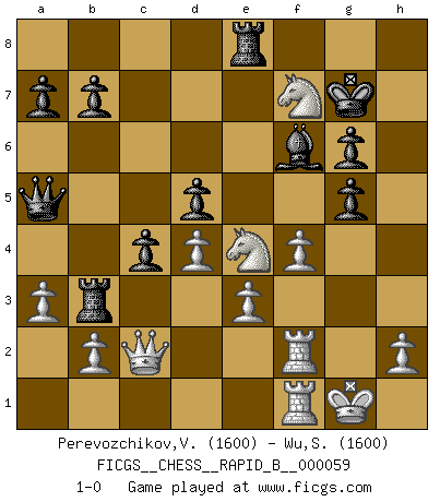 Last move : 1-0 2007 July 26 4:4:20 [Event "FICGS__CHESS__RAPID_B__000059"] [Site "FICGS"] [Date "2007.07.20"] [Round "1"] [White "Perevozchikov,Vjacheslav"] [Black "Wu,Sheng"] [Result "1-0"] [WhiteElo "1600"] [BlackElo "1600"] 1.d4 Nf6 2.c4 e6 3.Nf3 d5 4.Nc3 Bb4 5.Bg5 Nbd7 6.cxd5 exd5 7.e3 c5 8.Bd3 Qa5 9.Qc2 c4 10.Bf5 O-O 11.O-O Re8 12.Nd2 g6 13.Bh3 Be7 14.Rad1 Nb6 15.Bxc8 Raxc8 16.Rfe1 Kg7 17.a3 Rc6 18.Re2 h6 19.Bxf6+ Bxf6 20.f4 Nc8 21.Nf3 Nd6 22.Ne5 Rb6 23.g4 Rd8 24.Rf1 Rb3 25.Ref2 Re8 26.g5 hxg5 27.Nxf7 Ne4 28.Nxe4 1-0 Queen's pawn game Kingside Castling by player Black (move 10) Kingside Castling by player White (move 11) Player White won this chess game. Follow this game move after move (download)Chess is really ninety nine percent calculation. (Soltis) Kann Schach nicht schließlich das Nationalspiel der Deutschen werden? Und welche weiteren Ausblicke bieten sich dann dar! Welche Hebung des allgemeinen Kultur-Niveaus, ja der Moral, wenn das Schachbrett den Kartentisch verdrängen würde! Wahrlich, ein Ziel, des Schweißes der Edlen wert! (Siegbert Tarrasch) Yo nunca en mi vida he jugado la Defensa Francesa, que viene siendo la más aburrida de todas las Aperturas. (Wilhelm Steinitz) Vous m'avez demandé de vous exposer quel est le fondement de la prière. Je ne fais que préparer les pièces du jeu sur la table... Nous sera-t-il permis d'en adopter les règles et si nous les appliquons scrupuleusement nous ne tarderons pas à faire mat le Roi divin ! Il ne pourra échapper à nos mains. (Sainte Thérèse d'Avila, Chemin de perfection) Always remember that you are unique; just like everyone else. (Unknown)