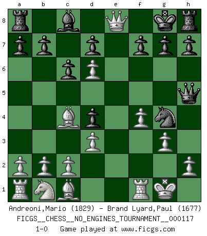 Last move : 1-0 2021 October 6 18:12:44 [Event "FICGS__CHESS__NO_ENGINES_TOURNAMENT__000117"] [Site "FICGS"] [Date "2021.09.26"] [Round "1"] [White "Andreoni,Mario"] [Black "Brand Lyard,Paul"] [Result "1-0"] [WhiteElo "1829"] [BlackElo "1677"] 1.e4 e5 2.Nf3 Nc6 3.Bb5 Qf6 4.O-O Nd4 5.Nxd4 exd4 6.d3 c6 7.Bc4 Bd6 8.f4 Nh6 9.e5 Qh4 10.exd6 Ng4 11.Qe2+ Kf8 12.g3 Qh5 13.Qe7+ Kg8 14.Qe8+ 1-0 Ruy Lopez (Spanish Opening) Kingside Castling by player White (move 4) Player White won this chess game. Follow this game move after move (download)Of all my Russian books, the defense contains and diffuses the greatest 'warmth' which may seem odd seeing how supremely abstract Chess is supposed to be. (Vladimir Nabokov) Die westlichen Werte sind eine Sprache, welche die Putin-Administration nicht versteht. (Garry Kasparov) Con el fin de mejorar tu juego, debes de estudiar los finales antes que todo, ya que mientras que los finales pueden ser estudiados y dominados por sí mismos, el juegomedio y la apertura deben de ser estudiados en relación con los finales. (José Raúl Capablanca) Les Echecs mettent en conflit, non pas deux intelligences, mais deux volontés. (Lasker) Vladimir Ras-Putin is still alive... He is also a good actor, I saw him in the Lord of the Rings. (Rodolfo d'Ettorre)