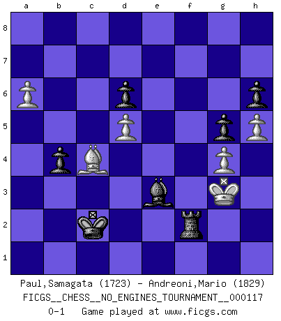 Last move : 0-1 2021 October 20 20:51:26 [Event "FICGS__CHESS__NO_ENGINES_TOURNAMENT__000117"] [Site "FICGS"] [Date "2021.09.26"] [Round "1"] [White "Paul,Samagata"] [Black "Andreoni,Mario"] [Result "0-1"] [WhiteElo "1723"] [BlackElo "1829"] 1.e4 c5 2.c4 Nc6 3.Nf3 d6 4.d3 g6 5.Nc3 Bg7 6.Bd2 f5 7.Be2 Nf6 8.Qc2 O-O 9.O-O a6 10.a3 Rb8 11.Rab1 Nd4 12.Nxd4 cxd4 13.Nd5 fxe4 14.dxe4 e5 15.Bg5 Be6 16.Bd3 Bxd5 17.exd5 Qb6 18.Kh1 Rbc8 19.Qd2 Rce8 20.f3 Qb3 21.Rfe1 Nh5 22.Re4 Nf4 23.Bxf4 Rxf4 24.Rbe1 Bh6 25.Rxf4 Bxf4 26.Qc2 Qxc2 27.Bxc2 Rc8 28.b3 Be3 29.g4 b5 30.Bd3 bxc4 31.Bxc4 Kf7 32.Kg2 a5 33.a4 Ke7 34.h4 h6 35.Re2 Kf6 36.Kg3 g5 37.h5 e4 38.fxe4 Ke5 39.Kf3 Rf8+ 40.Kg3 Kxe4 41.Re1 d3 42.Rd1 Rf3+ 43.Kg2 Rf2+ 44.Kg3 d2 45.b4 axb4 46.a5 Kd4 47.Bf1 Kc3 48.a6 Kc2 49.Ra1 d1Q 50.Rxd1 Kxd1 51.Bc4 Kc2 0-1 Sicilian defense Kingside Castling by player Black (move 8) Kingside Castling by player White (move 9) Promotion Queen by player Black (move 49) Player Black won this chess game. Follow this game move after move (download)With or without the title, Bobby Fischer was unquestionably the greatest player of his time. (Burt Hochberg) Wenn du gegen Bobby spielst, ist es keine Frage von gewinnen oder verlieren. Es ist eine Frage des Überlebens. (Boris Vassilievich Spassky) Los libros de Ajedrez deben de usarse igual como usamos los anteojos: para mejorar la vista, aunque algunos jugadores los quieren usar como si ellos les otorgaran la vision. (José Raúl Capablanca) La guerre est enfant de la passion, la passion est enfant du narcissisme et le narcissisme est l'enfant. (...) Une autre partie ? (Thibault de Vassal) Gambling is the son of avarice and the father of despair. (French proverb)