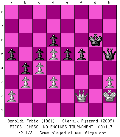 Last move : 1/2-1/2 2021 November 30 15:51:7 [Event "FICGS__CHESS__NO_ENGINES_TOURNAMENT__000117"] [Site "FICGS"] [Date "2021.09.26"] [Round "1"] [White "Bonoldi,Fabio"] [Black "Sternik,Ryszard"] [Result "1/2-1/2"] [WhiteElo "1961"] [BlackElo "2009"] 1.c4 Nf6 2.g3 e5 3.Bg2 d6 4.Nc3 Be7 5.d3 O-O 6.e4 h6 7.Nge2 c6 8.O-O Re8 9.h3 c5 10.Be3 Nc6 11.Qd2 a6 12.f4 Rb8 13.Rae1 Bd7 14.f5 b5 15.b3 Nd4 16.g4 Bc6 17.Ng3 Nd7 18.Nd5 Bh4 19.Kh2 a5 20.Rb1 b4 21.Nh5 Bxd5 22.exd5 Nf6 23.Nxg7 Kxg7 24.Bxh6+ Kg8 25.g5 Kh8 26.gxf6 Qxf6 27.Be4 Rg8 28.Rg1 Nxf5 29.Bxf5 Qxf5 30.Qe2 Qh7 31.Be3 Rbe8 32.Rxg8+ Rxg8 33.Rg1 Rxg1 34.Bxg1 Qg6 35.Qf3 f5 36.Bf2 Bxf2 37.Qxf2 Qh5 38.Qg2 Kh7 39.Qf2 Kg6 1/2-1/2 English, 1...Nf6 (Anglo-Indian defense) Kingside Castling by player Black (move 5) Kingside Castling by player White (move 8) This chess game ended in a draw. Follow this game move after move (download)What is the object of playing a gambit opening?... To acquire a reputation of being a dashing player at the cost of losing a game. (Siegbert Tarrasch) Es liegt in der Natur, vernüftig zu denken und unlogisch zu handeln. (Anatole France) Buenas posiciones no logran ganar juegos, buenas movidas sí. (Gerald Abrahams) Le profane ne songe pas à la somme de jouissance dont il se prive, qui méconnaît ce jeu aux ressources aussi variées que passionnantes. (Jean-Marie Jeanton-Lamarche) A bird doesn't sing because it has an answer, it sings because it has a song. (Maya Angelou)