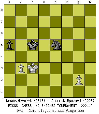 Last move : 0-1 2021 November 15 17:36:54 [Event "FICGS__CHESS__NO_ENGINES_TOURNAMENT__000117"] [Site "FICGS"] [Date "2021.09.26"] [Round "1"] [White "Kruse,Herbert"] [Black "Sternik,Ryszard"] [Result "0-1"] [WhiteElo "2516"] [BlackElo "2009"] 1.e4 d6 2.d4 Nf6 3.Bd3 e5 4.c3 Nbd7 5.Nf3 h6 6.O-O c6 7.Re1 Be7 8.Nbd2 O-O 9.a4 Qc7 10.h3 Re8 11.Nc4 exd4 12.cxd4 d5 13.exd5 Nxd5 14.a5 N7f6 15.Bd2 a6 16.Qb3 Bf8 17.Rxe8 Nxe8 18.Nb6 Nxb6 19.axb6 Qd6 20.Bc4 Be6 21.Bxe6 Qxe6 22.Qxe6 fxe6 23.Re1 Nd6 24.b3 Re8 25.Bb4 Nb5 26.Bc5 g5 27.h4 gxh4 28.Nxh4 Kf7 29.Re4 Bg7 30.Rf4+ Kg8 31.Ng6 Rd8 32.Ne7+ Kh7 33.Rf7 h5 34.f4 Kh6 35.f5 Bxd4+ 36.Bxd4 Nxd4 37.fxe6 Kg5 38.Nxc6 Nxc6 39.Rxb7 Kf6 40.Rc7 Nb8 41.Rh7 Kxe6 42.Rxh5 Rd4 43.Rh8 Nc6 44.Ra8 a5 45.b7 Rb4 46.b8Q Rxb8 47.Rxb8 Nxb8 48.Kf2 Nc6 49.Ke3 Kd5 50.Kd3 Ne5+ 51.Kc3 Kc5 0-1 King's pawn Opening Kingside Castling by player White (move 6) Kingside Castling by player Black (move 8) 10 pieces endgame at move 41 : White KRPPP , Black KRNPP WHITE : King + 1 Rook 3 Pawns BLACK : King + 1 Rook 1 Knight 2 Pawns 9 pieces endgame at move 42 : White KRPPP , Black KRNP WHITE : King + 1 Rook 3 Pawns BLACK : King + 1 Rook 1 Knight 1 Pawn Promotion Queen by player White (move 46) 8 pieces endgame at move 46 : White KRPP , Black KRNP WHITE : King + 1 Rook 2 Pawns BLACK : King + 1 Rook 1 Knight 1 Pawn 7 pieces endgame at move 47 : White KRPP , Black KNP WHITE : King + 1 Rook 2 Pawns BLACK : King + 1 Knight 1 Pawn 6 pieces endgame at move 47 : White KPP , Black KNP WHITE : King + 2 Pawns BLACK : King + 1 Knight 1 Pawn Player Black won this chess game. Follow this game move after move (download)An attack on the wing should be met by play in the center. (Nimzovitch) Vielleicht wirkt die Aura früherer Spieler glanzvoller als die der heutigen Spieler, aber das liegt daran, dass man kein Programm wie Fritz hatte, das einem all die Löcher in ihren Partien zeigt. (Vladimir Kramnik) Jugadores de primera clase pierden en contra de jugadores de segunda clase porque los jugadores de segunda clase a veces juegan una partida de primer clase. (Siegbert Tarrasch) C'est la seule position que je connaisse où les deux camps sont mals. Propos prêtés à V. Anand. To steal ideas from one person is plagiarism. To steal from many is research. (Unknown)