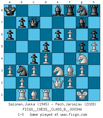 Last move : 1-0 2022 April 4 23:6:15 [Event "FICGS__CHESS__CLASS_B__000346"] [Site "FICGS"] [Date "2021.09.27"] [Round "1"] [White "Salonen,Jukka"] [Black "Pech,Jaroslav"] [Result "1-0"] [WhiteElo "1945"] [BlackElo "2028"] 1.e4 e6 2.d4 d5 3.e5 c5 4.c3 Nc6 5.Nf3 Qb6 6.a3 c4 7.Nbd2 Na5 8.g3 Bd7 9.h4 O-O-O 10.Bh3 h6 11.h5 Ne7 12.Nh4 Kb8 13.Qf3 g5 14.Ng2 Rh7 15.Ne3 Ba4 16.O-O Ng8 17.Re1 Qc7 18.Ng4 Bg7 19.Nf1 Rh8 20.Nfe3 Rf8 21.Qe2 Nb3 22.Rb1 Ka8 23.Bg2 a6 24.Rd1 Be8 25.Bf3 f6 26.exf6 1-0 This chess game has been lost on time (started : 2021.09.27 16:4:35) French : Advance, Paulsen attack Queenside Castling by player Black (move 9) Kingside Castling by player White (move 16) Player White won this chess game. Follow this game move after move (download)As one by one I mowed them down, my superiority soon became apparent. (Jose Capablanca) Wir irren allesamt, nur jeder irrt anders. (Georg Christoph Lichtenberg) Los errores estan ahí, esperando a que se cometan. (Savielly Tartakower) On n'a jamais que l'âge auquel on a commence à jouer aux échecs car après on cesse de vieillir. (Capablanca) Internet: Absolute communication, absolute isolation. (Paul Carvel)