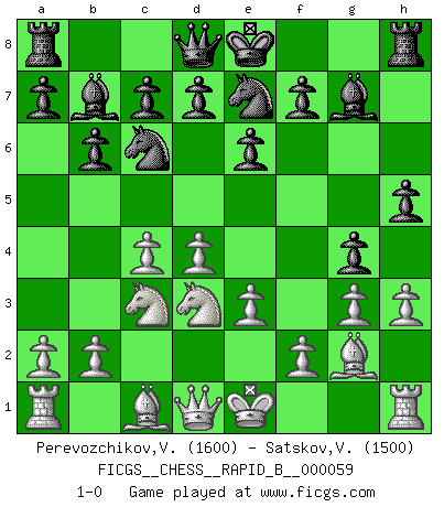 Last move : 1-0 2007 August 29 12:5:53 [Event "FICGS__CHESS__RAPID_B__000059"] [Site "FICGS"] [Date "2007.07.20"] [Round "1"] [White "Perevozchikov,Vjacheslav"] [Black "Satskov,Vitaly"] [Result "1-0"] [WhiteElo "1600"] [BlackElo "1500"] 1.Nf3 e6 2.c4 g5 3.d4 g4 4.Ne5 h5 5.Nd3 Bg7 6.e3 Ne7 7.Nc3 Nbc6 8.g3 b6 9.Bg2 Bb7 10.h3 1-0 This chess game has been lost on time (started : 2007.07.20 17:6:11) Reti Opening Player White won this chess game. Follow this game move after move (download)Capture of the adverse King is the ultimate but not the first object of the game. (William Steinitz) Jede Eröffnung ist gut genug um gespielt zu werden, wenn nur ihr Ruf schlecht genug ist. (Savielly Grigorievitsch Tartakower) En el Ajedrez, cuando menos, el valiente hereda la tierra. (Edmar Mednis) RxDa4 pat (...) There is far too much law for those who can afford it and far too little for those who cannot. (Derek Bok)