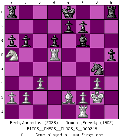 Last move : 0-1 2022 April 6 5:1:22 [Event "FICGS__CHESS__CLASS_B__000346"] [Site "FICGS"] [Date "2021.09.27"] [Round "1"] [White "Pech,Jaroslav"] [Black "Dumont,Freddy"] [Result "0-1"] [WhiteElo "2028"] [BlackElo "1902"] 1.e4 c5 2.Nf3 d6 3.d4 cxd4 4.Nxd4 Nf6 5.Nc3 a6 6.Be3 Ng4 7.Bg5 h6 8.Bh4 g5 9.Bg3 Bg7 10.Be2 h5 11.h4 gxh4 12.Bxh4 Nc6 13.Nb3 Be6 14.Qd2 Qb6 15.Nd5 Bxd5 16.exd5 Nce5 17.Qa5 Qxa5+ 18.Nxa5 Ng6 19.c3 Nf4 20.g3 Nxd5 21.O-O Bf6 22.Rad1 Bxh4 23.Rxd5 Bf6 24.Kg2 b6 0-1 This chess game has been lost on time (started : 2021.09.27 16:4:35) Sicilian : Najdorf, Byrne (English) attack Kingside Castling by player White (move 21) Player Black won this chess game. Follow this game move after move (download)Everything is in a state of flux, and this includes the world of Chess. (Mikhail Botvinnik) Es hat in meinem Leben Zeiten gegeben, da ich sehr nahe daran war zu glauben, daß ich auch nicht eine einzige Schachpartie verlieren könnte. (José Raúl Capablanca) Estaba muy claro de que el punto vulnerable del Gran Maestro Americano (Bobby Fischer) radicaba en las posiciones de doble filo, colgantes, irracionales, donde el siempre falló en encontrar un triunfo aún en una posición de clara victoria. (Efim Geller) Le jeu d'échecs est comme rejeté hors du temps. (Antoine de Saint-Exupéry) Experiences are the keys to life. (Daniel Parmet)