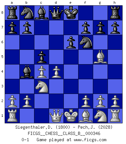 Last move : 0-1 2021 December 15 0:13:16 [Event "FICGS__CHESS__CLASS_B__000346"] [Site "FICGS"] [Date "2021.09.27"] [Round "1"] [White "Siegenthaler,David"] [Black "Pech,Jaroslav"] [Result "0-1"] [WhiteElo "1800"] [BlackElo "2028"] 1.d4 d5 2.c4 c6 3.Nc3 Nf6 4.Bg5 e6 5.e4 dxe4 6.Nxe4 Bb4+ 7.Nc3 c5 0-1 This chess game has been lost on time (started : 2021.09.27 16:4:35) QGD Slav defense Player Black won this chess game. Follow this game move after move (download)Play the opening like a book, the middle game like a magician, and the endgame like a machine. (Spielmann) Taktik ist was man tun muß, wenn etwas zu tun ist. Strategie ist was man tun muß, wenn nichts zu tun ist. (Savielly Grigorievitsch Tartakower) El ganador de una partida es aquel jugador que hace el penúltimo error. (Savielly Tartakover) Nous vivons dans un monde échiquéen : chaque jour qui passe est un défi à relever. (Philosophe Sasha) Art is not a thing, it is a way. (Elbert Hubbard)