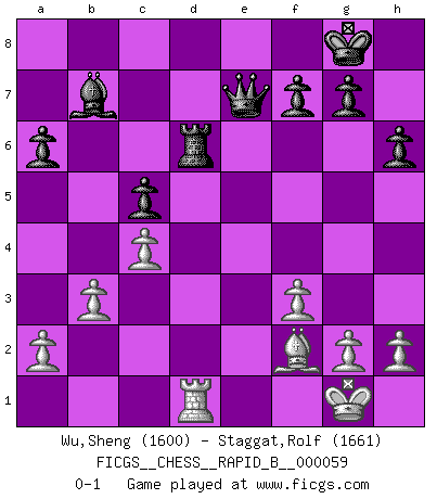 Last move : 0-1 2007 August 22 12:45:0 [Event "FICGS__CHESS__RAPID_B__000059"] [Site "FICGS"] [Date "2007.07.20"] [Round "1"] [White "Wu,Sheng"] [Black "Staggat,Rolf"] [Result "0-1"] [WhiteElo "1600"] [BlackElo "1661"] 1.e4 e5 2.Nf3 Nc6 3.Bb5 Nf6 4.O-O Nxe4 5.d4 Be7 6.Qe2 Nd6 7.Bxc6 bxc6 8.dxe5 Nb7 9.Nc3 O-O 10.Re1 Nc5 11.Be3 Ne6 12.Nd4 Nxd4 13.Bxd4 c5 14.Be3 d5 15.exd6 Bxd6 16.Ne4 Bb7 17.Nxd6 cxd6 18.f3 Qf6 19.Rad1 Rae8 20.Qd3 Re6 21.Bf2 Rxe1+ 22.Rxe1 h6 23.b3 Rd8 24.c4 a6 25.Rd1 Qe7 26.Qxd6 Rxd6 0-1 Ruy Lopez : Open Berlin defense, 5...Be7 Kingside Castling by player White (move 4) Kingside Castling by player Black (move 9) Player Black won this chess game. Follow this game move after move (download)Examine moves that smite! A good eye for smites is far more important than a knowledge of strategical principles. (Purdy) In Buenos Aires ist es nicht mein vorrangiges Ziel ein starkes Turnier zu organisieren, sondern ein Turnier für Gentlemen. Ich würde nie Kamsky einladen. Ich mag keine Probleme. (Miguel Najdorf) El Ajedrez es 99 por ciento táctica. (Teichmann) Toutes les manuvres exécutées sur une colonne ouverte ont pour but ultime l'intrusion définitive sur la septième ou la huitième rangée, en plein cur de la position ennemie. (Aaron Nimzovitch) Bobby never cared about money, though. His only desire was to prove that his choices were correct: He wanted chess to be important because he was a chess player, and he wanted to be important. Bobby knew money was important, but he didn't have a clue why, outside of clothes and status. The only way he could accomplish what he wanted was to fight for a lot of money. Once he got it, he gave it away. He did not know how to spend it. And once he'd become champion, after, essentially, sacrificing his life for it, he didn't know how to spend his time. (Bob Wade)
