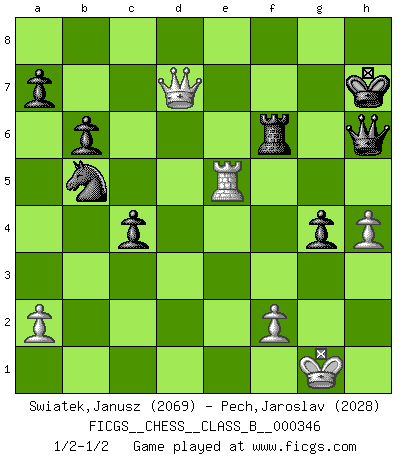 Last move : 1/2-1/2 2022 March 20 12:19:40 [Event "FICGS__CHESS__CLASS_B__000346"] [Site "FICGS"] [Date "2021.09.27"] [Round "1"] [White "Swiatek,Janusz"] [Black "Pech,Jaroslav"] [Result "1/2-1/2"] [WhiteElo "2069"] [BlackElo "2028"] 1.e4 c6 2.d4 d5 3.e5 Bf5 4.h4 h5 5.Bd3 Bxd3 6.Qxd3 e6 7.Nf3 c5 8.dxc5 Bxc5 9.c4 Ne7 10.O-O Nbc6 11.Nc3 Bb4 12.Bg5 Bxc3 13.bxc3 O-O 14.Rab1 b6 15.Rfe1 Rc8 16.Rbd1 Qc7 17.Qe2 dxc4 18.Bxe7 Nxe7 19.Ng5 g6 20.g4 Nd5 21.Rd4 Nxc3 22.Qc2 Nb5 23.Rf4 hxg4 24.Nxe6 fxe6 25.Qxg6+ Qg7 26.Qxe6+ Kh7 27.Rf5 Qh6 28.Rf6 Rxf6 29.exf6 Rf8 30.Re5 Rxf6 31.Qd7+ 1/2-1/2 Caro-Kann : Advance variation Kingside Castling by player White (move 10) Kingside Castling by player Black (move 13) This chess game ended in a draw. Follow this game move after move (download)At this time Fischer is simply a level above all the best Chessplayers in the world. (John Jacobs) Im Schach gibt es keinen Platz für Galanterie. (Irving Chernev) Un buen jugador siempre tiene buena suerte. (José Raúl Capablanca) L'ordinateur a tué l'originalité. Il n'y a plus guère d'aventures sur l'échiquier. (Jacob Murray) Secret operations are essential in war; upon them the army relies to make its every move. (Sun Tzu)