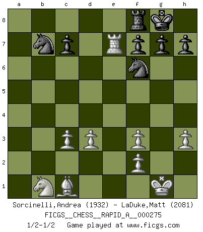 Last move : 1/2-1/2 2021 October 18 1:27:7 [Event "FICGS__CHESS__RAPID_A__000275"] [Site "FICGS"] [Date "2021.09.28"] [Round "1"] [White "Sorcinelli,Andrea"] [Black "LaDuke,Matt"] [Result "1/2-1/2"] [WhiteElo "1932"] [BlackElo "2081"] 1.e4 e5 2.Nf3 Nc6 3.Bb5 a6 4.Ba4 Be7 5.O-O Nf6 6.Re1 b5 7.Bb3 O-O 8.a4 b4 9.a5 d6 10.c3 Rb8 11.Bc4 Bg4 12.h3 Bh5 13.Bxa6 d5 14.exd5 Qxd5 15.d3 Bxf3 16.Qxf3 Qxf3 17.gxf3 bxc3 18.bxc3 Ra8 19.Bb7 Rxa5 20.Rxa5 Nxa5 21.Rxe5 Nxb7 22.Rxe7 1/2-1/2 Ruy Lopez Kingside Castling by player White (move 5) Kingside Castling by player Black (move 7) This chess game ended in a draw. Follow this game move after move (download)Fischer is under obligation to nobody. (Joseph Platz) Immer nach dem besten Zug zu suchen ist ziemlich unpraktisch. (Nigel Short) El Ajedrez tiene tanto misterio como las mujeres. (Purdy) La victoire dans une partie d'Echecs appartient la plupart du temps à celui qui voit un peu plus loin que l'adversaire. (Lasker) Luck is when opportunity knocks and you answer. (Anonymous)