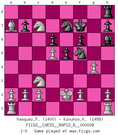 Last move : 1-0 2006 September 22 20:47:39 [Event "FICGS__CHESS__RAPID_B__000008"] [Site "FICGS"] [Date "2006.06.24"] [Round "1"] [White "Vasquez,Fernando"] [Black "Konuhov,Konstantin"] [Result "1-0"] [WhiteElo "1400"] [BlackElo "1488"] 1.e4 e5 2.Nf3 Nc6 3.d4 f6 4.d5 Nce7 5.Nh4 d6 6.Nc3 g5 7.Qh5+ Kd7 8.Nf3 Qe8 9.Qxe8+ Kxe8 10.Be3 Bg4 11.Be2 c6 12.Nxg5 Bxe2 13.Ne6 Rc8 14.Kxe2 cxd5 15.exd5 Bh6 16.Bxa7 Ra8 17.Nc7+ Kf7 18.Nxa8 Nf5 19.Nc7 Nge7 20.g4 1-0 This chess game has been lost on time (started : 2006.06.24 18:33:5) Scotch Opening Player White won this chess game. Follow this game move after move (download)Dazzling combinations are for the many, shifting wood is for the few. (Georg Kieninger) Schach ist das Spiel, das die Verrückten gesund hält. (Albert Einstein) Las Aperturas te enseñan aperturas. ¡Los Finales te enseñan Ajedrez!. (Stephan Gerzadowicz) Le plus grand jeu de l'esprit jamais inventé, plus vous l'apprenez, plus vous y prenez du plaisir. (Garry Kasparov) The greatest con, that he ever pulled... was making you believe... that he is you. (Revolver, movie)