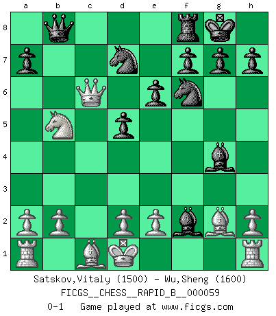 Last move : 0-1 2007 September 2 6:43:23 [Event "FICGS__CHESS__RAPID_B__000059"] [Site "FICGS"] [Date "2007.07.20"] [Round "1"] [White "Satskov,Vitaly"] [Black "Wu,Sheng"] [Result "0-1"] [WhiteElo "1500"] [BlackElo "1600"] 1.g4 d5 2.Bg2 Bxg4 3.c4 c6 4.cxd5 Nf6 5.Qb3 cxd5 6.Qxb7 Nbd7 7.Nc3 e6 8.Nb5 Rc8 9.Nf3 Bc5 10.Nfd4 O-O 11.Nc6 Bxf2+ 12.Kd1 Rxc6 13.Qxc6 Qb8 0-1 This chess game has been lost on time (started : 2007.07.20 17:6:11) Grob : Fritz gambit Kingside Castling by player Black (move 10) Player Black won this chess game. Follow this game move after move (download)If cunning alone were needed to excel, women would be the best Chess players. (Albin) Ich kämpfe solange mein Gegner einen Fehler machen kann. (Emanuel Lasker) Debió haber existido una vez en que los hombres eran semidióses, de otra manera no hubiesen podido inventar el Ajedrez. (Gustav Schenk) La vie et les Echecs sont tous les deux une lutte constante. (Lasker) When I took office, only high energy physicists had ever heard of what is called the World Wide Web... Now even my cat has its own page. (Bill Clinton, 1996)