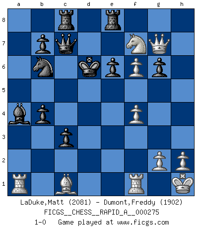 Last move : 1-0 2022 February 12 14:31:32 [Event "FICGS__CHESS__RAPID_A__000275"] [Site "FICGS"] [Date "2021.09.28"] [Round "1"] [White "LaDuke,Matt"] [Black "Dumont,Freddy"] [Result "1-0"] [WhiteElo "2081"] [BlackElo "1902"] 1.e4 c5 2.Nf3 d6 3.Bb5+ Nd7 4.c4 a6 5.Ba4 Ngf6 6.Nc3 e6 7.d4 cxd4 8.Nxd4 Be7 9.Qe2 O-O 10.O-O Qc7 11.Kh1 Nb6 12.Bb3 Bd7 13.Nc2 Rac8 14.Ne3 Bc6 15.f3 Nh5 16.Nc2 Be8 17.f4 Nf6 18.Ne3 Bc6 19.Bc2 Rfe8 20.a4 Bf8 21.b4 Bd7 22.Bd3 d5 23.e5 dxc4 24.Bc2 Nfd5 25.Bxh7+ Kxh7 26.Qh5+ Kg8 27.Ne4 g6 28.Qh3 Bg7 29.Ng4 c3 30.Ng5 Kf8 31.Nh7+ Kg8 32.Ng5 Kf8 33.Qh7 Bxa4 34.b5 axb5 35.Nf6 b4 36.Qg8+ Ke7 37.Qxg7 Nxf6 38.exf6+ Kd6 39.Nxf7+ 1-0 This chess game has been lost on time (started : 2021.09.28 3:21:28) Sicilian : Canal-Sokolsky (Nimzovich-Rossolimo, Moscow) attack Kingside Castling by player Black (move 9) Kingside Castling by player White (move 10) Player White won this chess game. Follow this game move after move (download)I like the moment when I break a man's ego. (Bobby Fischer) Ich habe Putins Aufstieg an die Macht beobachtet und seine Politik, die demokratischen Institutionen meines Landes zu zerstören. (Garry Kasparov) Juega la Apertura como un libro, el Juego Medio como un mago y los Finales como una máquina. (Spielmann) La vie est comme un jeu d'échecs : nous esquissons un plan, mais celui-ci est tributaire de ce que daignent faire l'adversaire aux échecs et le destin dans la vie. (Arthur Schopenhauer) Kids, you tried your best and you failed miserably. The lesson is, never try. (Simpsons)