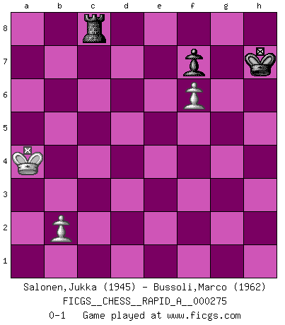 Last move : 0-1 2021 November 19 7:57:43 [Event "FICGS__CHESS__RAPID_A__000275"] [Site "FICGS"] [Date "2021.09.28"] [Round "1"] [White "Salonen,Jukka"] [Black "Bussoli,Marco"] [Result "0-1"] [WhiteElo "1945"] [BlackElo "1962"] 1.e4 c5 2.Nf3 d6 3.d4 cxd4 4.Nxd4 Nf6 5.Nc3 a6 6.Bg5 e6 7.f4 Nbd7 8.Qf3 Qc7 9.O-O-O b5 10.a3 Rb8 11.f5 e5 12.Nb3 h6 13.Bd2 b4 14.axb4 Rxb4 15.Bd3 Be7 16.g4 Bb7 17.h4 d5 18.exd5 Rxg4 19.Qe2 Bb4 20.Bxa6 Bxa6 21.Qxa6 O-O 22.Rhg1 h5 23.Rxg4 hxg4 24.Kb1 Rc8 25.Qd3 Nb6 26.Ne4 Nfxd5 27.Rg1 Bxd2 28.Nbxd2 Nf4 29.Qb3 Nbd5 30.Rxg4 Qc6 31.c4 Nf6 32.Nxf6+ Qxf6 33.Qc2 Qb6 34.h5 Qf2 35.h6 Rd8 36.Rxg7+ Kh8 37.f6 Qe1+ 38.Qc1 Qe3 39.Qc2 Nd3 40.Nb3 Rb8 41.Qd1 Qe4 42.Rg4 Qf5 43.Rg5 Qxg5 44.Qxd3 e4 45.Qc3 e3 46.Nc1 Rd8 47.Ka2 Qg6 48.Qxe3 Qc2 49.Qf3 Qxc1 50.Qe2 Rb8 51.h7 Rd8 52.Kb3 Rc8 53.Ka2 Qxc4+ 54.Qxc4 Rxc4 55.Kb3 Rc8 56.Ka4 Kxh7 0-1 Sicilian : Najdorf, 7.f4 Queenside Castling by player White (move 9) Kingside Castling by player Black (move 21) 10 pieces endgame at move 49 : White KQPPPP , Black KQRP WHITE : King + 1 Queen 4 Pawns BLACK : King + 1 Queen 1 Rook 1 Pawn 9 pieces endgame at move 53 : White KQPPP , Black KQRP WHITE : King + 1 Queen 3 Pawns BLACK : King + 1 Queen 1 Rook 1 Pawn 8 pieces endgame at move 54 : White KQPPP , Black KRP WHITE : King + 1 Queen 3 Pawns BLACK : King + 1 Rook 1 Pawn 7 pieces endgame at move 54 : White KPPP , Black KRP WHITE : King + 3 Pawns BLACK : King + 1 Rook 1 Pawn 6 pieces endgame at move 56 : White KPP , Black KRP WHITE : King + 2 Pawns BLACK : King + 1 Rook 1 Pawn Player Black won this chess game. Follow this game move after move (download)We must make sure that Chess will not be like a dead language, very interesting, but for a very small group. (Sytze Faber) Vielleicht wirkt die Aura früherer Spieler glanzvoller als die der heutigen Spieler, aber das liegt daran, dass man kein Programm wie Fritz hatte, das einem all die Löcher in ihren Partien zeigt. (Vladimir Kramnik) Aunque la mayoría de la gente disfruta observar las partidas de los grandes Maestros de ataque, algunos de los jugadores mas notables en la historia han sido los jugadores silenciosos posicionales. Lentamente ellos te aplastan despojandote de tu espacio, congestionando tus piezas y dejandote virtualmente sin nada que hacer. (Yasser Seirawan) Les erreurs sont comme les malheurs, elles n'arrivent jamais seules. (Siegbert Tarrasch) Don't be irreplaceable, if you can't be replaced, you can't be promoted. (Dan Rotaru)