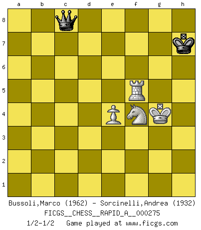 Last move : 1/2-1/2 2021 October 5 23:14:6 [Event "FICGS__CHESS__RAPID_A__000275"] [Site "FICGS"] [Date "2021.09.28"] [Round "1"] [White "Bussoli,Marco"] [Black "Sorcinelli,Andrea"] [Result "1/2-1/2"] [WhiteElo "1962"] [BlackElo "1932"] 1.e4 c5 2.Nf3 d6 3.d4 cxd4 4.Nxd4 Nf6 5.Nc3 a6 6.Be3 e5 7.Nb3 Be7 8.Be2 Be6 9.O-O O-O 10.Re1 Nc6 11.f3 b5 12.a4 bxa4 13.Rxa4 Qb8 14.Bc4 a5 15.Qe2 Rc8 16.Rea1 Bd8 17.Bf2 h6 18.Bxe6 fxe6 19.Kh1 d5 20.Nb5 d4 21.c3 Qb6 22.Be1 Nd7 23.c4 Be7 24.Nxa5 Nb4 25.Qd2 d3 26.Bf2 Bg5 27.Qe1 d2 28.Qe2 Nc5 29.Rxb4 Rxa5 30.Rd1 Rca8 31.h4 Bf4 32.g3 Qd8 33.gxf4 Ra1 34.Bxc5 Rxd1+ 35.Qxd1 Qxh4+ 36.Kg2 Qe1 37.Nc3 Ra1 38.Rb8+ Kh7 39.Qxa1 Qxa1 40.f5 exf5 41.Rd8 Qxb2 42.Nd1 Qc2 43.Nf2 Qxc4 44.Be3 f4 45.Bxd2 h5 46.Nd3 g5 47.Rd5 g4 48.Bxf4 exf4 49.Rxh5+ Kg8 50.Rg5+ Kh7 51.Nxf4 gxf3+ 52.Kxf3 Qc3+ 53.Kg4 Qc8+ 54.Rf5 Qg8+ 55.Kh4 Qd8+ 56.Kg3 Qg8+ 57.Kh4 Qd8+ 58.Kg3 Qg8+ 59.Kh3 Qc8 60.Kg4 1/2-1/2 Sicilian : Najdorf, Byrne (English) attack Kingside Castling by player White (move 9) Kingside Castling by player Black (move 9) 10 pieces endgame at move 48 : White KRNPP , Black KQPPP WHITE : King + 1 Rook 1 Knight 2 Pawns BLACK : King + 1 Queen 3 Pawns 9 pieces endgame at move 49 : White KRNPP , Black KQPP WHITE : King + 1 Rook 1 Knight 2 Pawns BLACK : King + 1 Queen 2 Pawns 8 pieces endgame at move 51 : White KRNPP , Black KQP WHITE : King + 1 Rook 1 Knight 2 Pawns BLACK : King + 1 Queen 1 Pawn 7 pieces endgame at move 51 : White KRNP , Black KQP WHITE : King + 1 Rook 1 Knight 1 Pawn BLACK : King + 1 Queen 1 Pawn 6 pieces endgame at move 52 : White KRNP , Black KQ WHITE : King + 1 Rook 1 Knight 1 Pawn BLACK : King + 1 Queen This chess game ended in a draw. Follow this game move after move (download)Life is like a game of Chess, changing with each move. (Chinese proverb) Computer sind die einzigen Gegner, die nicht immer eine Ausrede auf Lager haben, wenn sie gegen mich verlieren. (Robert James Fischer) Yo no le temo a Spassky. Todos saben que yo soy el mejor. Uno no necesita un torneo para probarlo. (Bobby Fischer) Echiquier : carré parfait, comme la Jérusalem nouvelle décrite par l'auteur de l'Apocalypse, huit cases sur huit, exaltation du chiffre 4, symbole du cosmos aux quatre horizons... où le noir et le blanc, l'ombre et la lumière, le mal et le bien s'entremêlent et se conjuguent. (Robert Couffignal, Le Gambit du poète) History is the quarrels of popes and kings, with wars or pestilences in every page; the men all so good for nothing, and hardly any women at all. (Jane Austen)