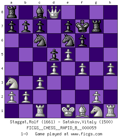 Last move : 1-0 2007 September 7 7:23:38 [Event "FICGS__CHESS__RAPID_B__000059"] [Site "FICGS"] [Date "2007.07.20"] [Round "1"] [White "Staggat,Rolf"] [Black "Satskov,Vitaly"] [Result "1-0"] [WhiteElo "1661"] [BlackElo "1500"] 1.e4 g5 2.d4 g4 3.Qxg4 d5 4.Qf4 Nc6 5.Na3 Bh6 6.Qg3 Bxc1 7.Rxc1 Nf6 8.e5 Rg8 9.Qd3 Ne4 10.f3 Ng5 11.h4 Ne6 12.Qxh7 Kf8 13.c3 f6 14.f4 Rg7 15.Qh8+ Kf7 16.Qxd8 1-0 This chess game has been lost on time (started : 2007.07.20 17:6:11) Reversed Grob (Borg/Basman defense/macho Grob) Player White won this chess game. Follow this game move after move (download)During a Chess competition a Chessmaster should be a combination of a beast of prey and a monk. (Alexander Alekhine) Smyslow ist ein Beweis dafür, dass ich noch zehn Jahre spielen kann! [der 75 jährige über den 85 jährigen] (Viktor Kortschnoi) Un Peón pasado es un criminal, quién debe ser mantenido bajo candado y llave. Leves medidas, tales como vigilancia policiaca, no son suficientes. (Aaron Nimzovich) Donnez-moi un Cavalier en 6e et je gagnerais toutes mes parties. (Steinitz) Big Chess is a place for big hallucinations. (Thibault de Vassal)