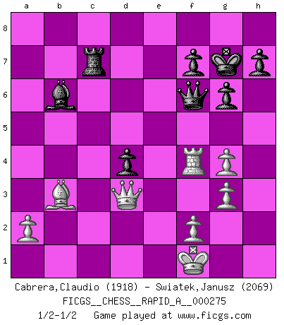 Last move : 1/2-1/2 2021 November 13 15:46:25 [Event "FICGS__CHESS__RAPID_A__000275"] [Site "FICGS"] [Date "2021.09.28"] [Round "1"] [White "Cabrera,Claudio"] [Black "Swiatek,Janusz"] [Result "1/2-1/2"] [WhiteElo "1918"] [BlackElo "2069"] 1.e4 e5 2.Nc3 Nc6 3.g3 a5 4.Bg2 Bc5 5.Nge2 Nge7 6.d3 d6 7.h3 Nd4 8.Nxd4 Bxd4 9.Ne2 Bb6 10.d4 exd4 11.Nxd4 O-O 12.O-O a4 13.c3 d5 14.e5 Nf5 15.Qd3 Nxd4 16.cxd4 c5 17.dxc5 Bxc5 18.Be3 d4 19.Rfd1 Bg4 20.Bg5 Qxg5 21.hxg4 Qxe5 22.Bxb7 Rab8 23.Bc6 Rxb2 24.Bxa4 g6 25.Bb3 Rc8 26.Rab1 Re2 27.Rbc1 Rc7 28.Kf1 Rb2 29.Rb1 Rxb1 30.Rxb1 Kg7 31.Re1 Qf6 32.Re4 Bb6 33.Rf4 1/2-1/2 Vienna : Paulsen variation Kingside Castling by player Black (move 11) Kingside Castling by player White (move 12) This chess game ended in a draw. Follow this game move after move (download)Nowadays, when you're not a grandmaster at 14, you can forget about it. (Anand Viswanathan) Ich erzeugte keinen Neid, da mich die Schachspieler als Musiker und die Musiker als Schachspieler betrachteten. (Mark Taimanov) Me gusta decir que Bobby Fischer fue el mejor jugador que jamás haya existido. Pero lo que hizo de Fischer un genio, fue su habilidad de mezclar una frescura y pragmatismo Americano con ideas Rusas acerca de la estrategia. (Bruce Pandolfini) Lorsque vous vous retrouvez devant une position atroce, ne tendez pas un ultime piège dérisoire avec l'intention d'abandonner si l'adversaire le déjoue ! Faites-vous plutôt un devoir de résister comme si votre vie en dépendait. Jouez le coup qui vous déplairait au centuple si vous étiez dans la peau de votre tortionnaire ! Unless I accept my faults I will most certainly doubt my virtues. (Hugh Prather)