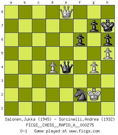 Last move : 0-1 2021 October 30 9:19:2 [Event "FICGS__CHESS__RAPID_A__000275"] [Site "FICGS"] [Date "2021.09.28"] [Round "1"] [White "Salonen,Jukka"] [Black "Sorcinelli,Andrea"] [Result "0-1"] [WhiteElo "1945"] [BlackElo "1932"] 1.d4 Nf6 2.Nc3 d5 3.Bg5 Nbd7 4.e3 e6 5.Bd3 c5 6.dxc5 Nxc5 7.Nf3 Be7 8.O-O O-O 9.Ne5 h6 10.Bf4 Bd7 11.Be2 Qb6 12.Qd4 Rfc8 13.a4 Be8 14.a5 Qd8 15.a6 Nxa6 16.Bxa6 bxa6 17.Rxa6 Bc5 18.Qd1 Bb4 19.Nd3 Bxc3 20.bxc3 Bb5 21.Ra3 Ne4 22.f3 Rxc3 23.Ra2 Nd6 24.Qd2 Rac8 25.Be5 R3c4 26.Rb1 a6 27.h3 Nf5 28.g4 Ne7 29.Bg3 Ng6 30.Qf2 f6 31.h4 e5 32.Nb4 a5 33.Nd3 Be8 34.h5 Nf8 35.Bh4 e4 36.Nf4 a4 37.Rd1 Bf7 38.fxe4 Rxe4 39.Rd4 Rc4 40.c3 Ne6 41.Rxe4 Rxe4 42.Bg3 Ng5 43.Qe2 Qe8 44.Bf2 d4 45.cxd4 Bxa2 46.Qxa2+ Kh7 47.Kh1 Rxf4 48.exf4 Qe4+ 49.Kg1 Qxf4 50.Qxa4 Nh3+ 51.Kg2 Nxf2 52.Qe8 Qe4+ 0-1 Queen's pawn game Kingside Castling by player White (move 8) Kingside Castling by player Black (move 8) Player Black won this chess game. Follow this game move after move (download)It is the aim of the modern school, not to treat every position according to one general law, but according to the principle inherent in the position. (Richard Reti) Ich rechne überhaupt nicht voraus. Ich gewinne auch so. (Robert James Fischer) Por esta medida (el intervalo entre Fischer y sus contemporaneos), yo le considero el mas grande campeón mundial. (Garry Kasparov) L'ordinateur a tué l'originalité. Il n'y a plus guère d'aventures sur l'échiquier. (Jacob Murray) Strategy without tactics is the slowest route to victory. Tactics without strategy is the noise before defeat. (Sun Tzu)