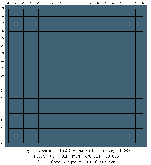 Last move : 0-1 2021 October 31 17:0:23 [Event "FICGS__GO__TOURNAMENT_KYU_III__000035"] [Site "FICGS"] [Date "2021.10.01"] [Round "1"] [Black "Grguric,Samuel"] [White "Dumesnil,Lindsay"] [Result "0-1"] [Rating 1 "1695"] [Rating 2 "1900"] 0-1 This go game has been lost on time (started : 2021.10.01 11:12:11) Here are the names of the openings (joseki) played in the four corners : Player White won this Go (weiqi, baduk) game. Follow this game move after move (download)The poor player plays the opponent's game for him. (Anonymous) The faster the computer, the slower the brain. (Thibault de Vassal)