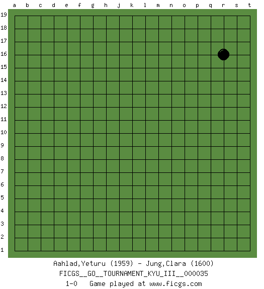 Last move : 1-0 2021 November 1 8:13:40 [Event "FICGS__GO__TOURNAMENT_KYU_III__000035"] [Site "FICGS"] [Date "2021.10.01"] [Round "1"] [Black "Aahlad,Yeturu"] [White "Jung,Clara"] [Result "1-0"] [Rating 1 "1959"] [Rating 2 "1600"] 1.r16 1-0 This go game has been lost on time (started : 2021.10.01 11:12:11) Here are the names of the openings (joseki) played in the four corners : Player Black won this Go (weiqi, baduk) game. Follow this game move after move (download)A few moments to learn, a lifetime to master. (Ancient proverb) The meaning of life is that it is to be lived, and it is not to be traded and conceptualized and squeezed into a pattern of systems. (Bruce Lee)